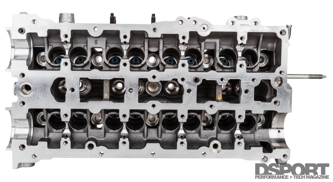 (Left) Here’s a look at the combustion chamber. Notice the center hole for the direct injection. (Right) The variable cam timing bridge is removed along with the rest of the valvetrain.