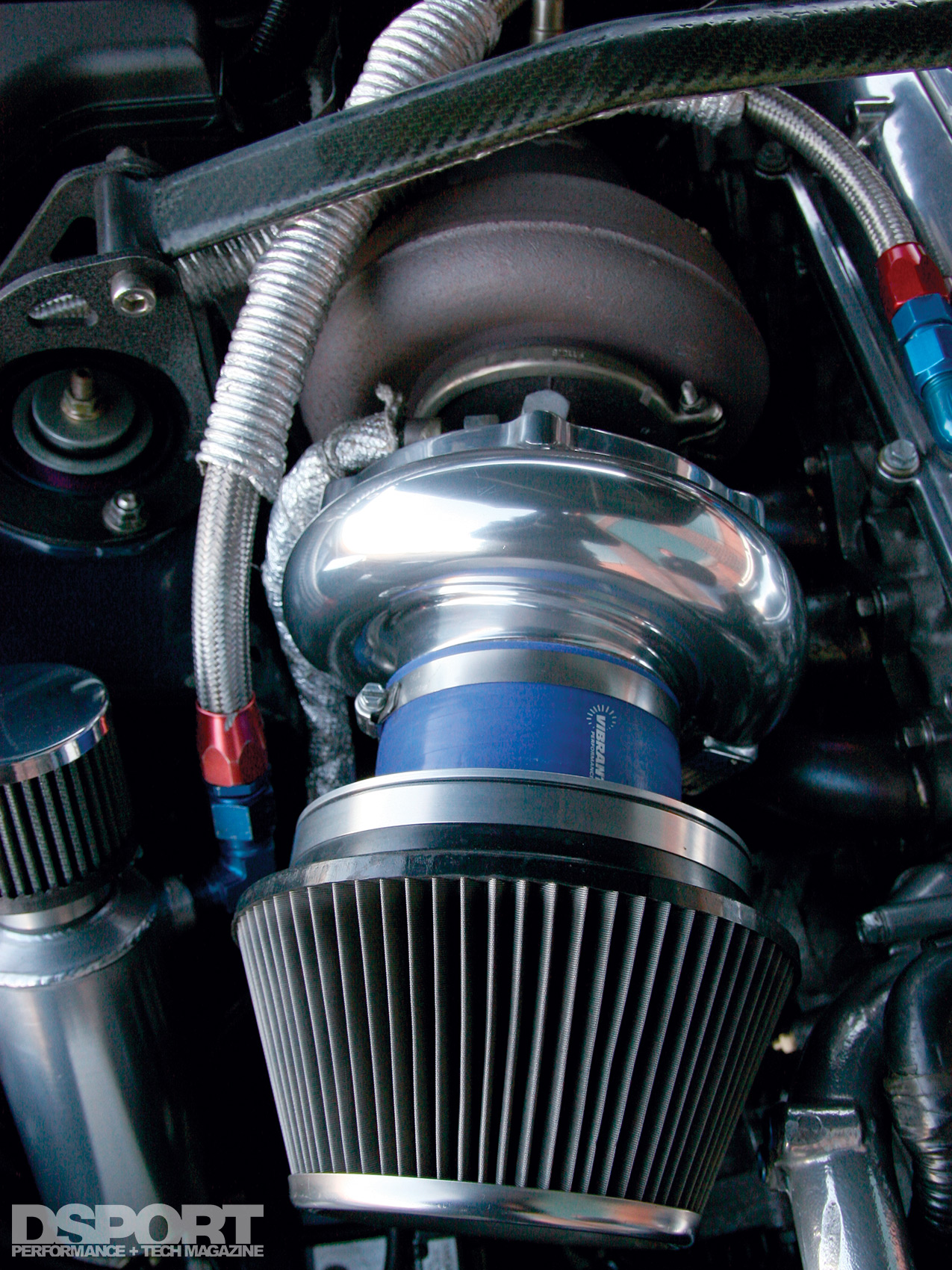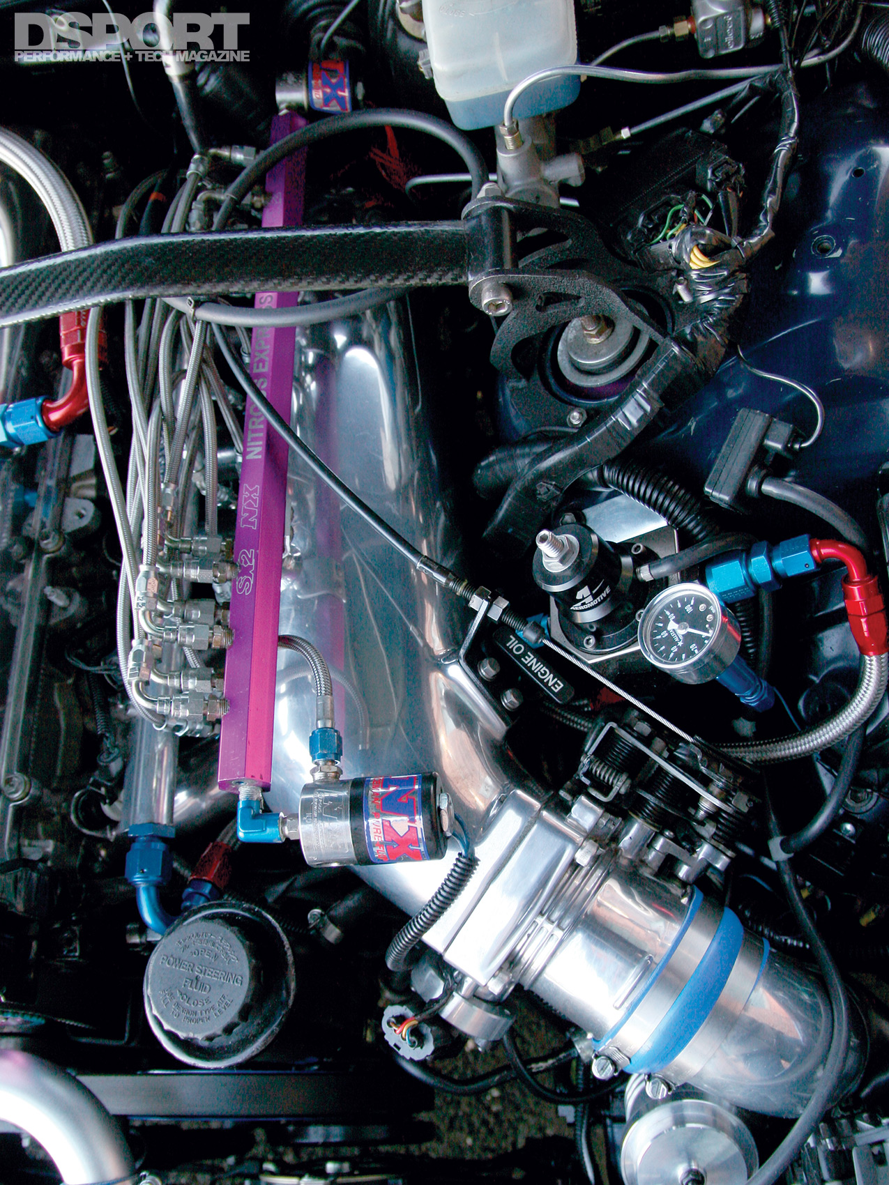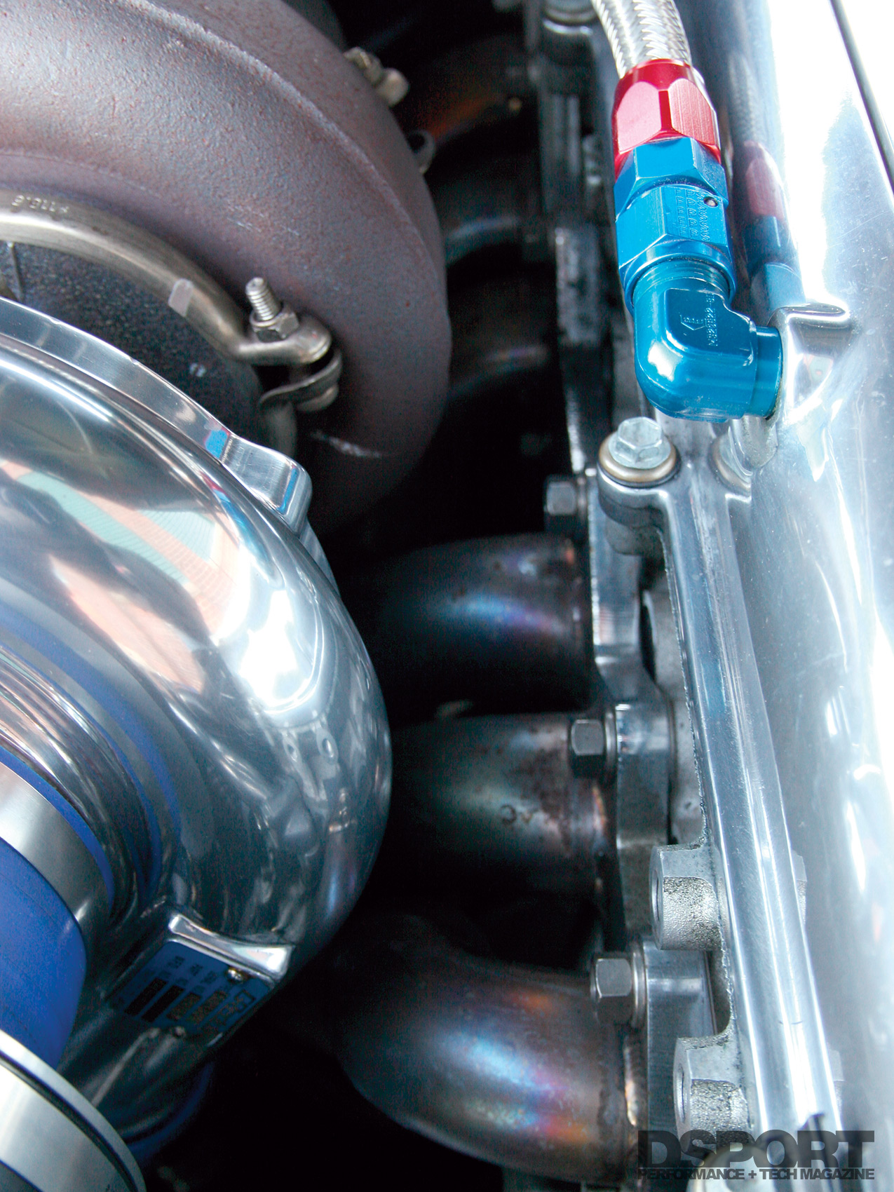 Compressed air from the turbocharger reaches the huge four- row GReddy front-mount intercooler by way of custom intercooler piping. The charge air then flows through an Infiniti Q45 throttle body and GReddy intake manifold. BPR plumbed in a Nitrous Express 200-shot direct- port nitrous-oxide system for that extra ‘kick’ on command. A six pack of Ford Motorsports 1,700cc/min fuel injectors deliver Sunoco Racing Fuel’s Maximal 116 octane race gas by way of an Aeromotive Eliminator fuel pump and a Titan Motorsports fuel rail. Denso Iridium spark plugs receive spark energy from an HKS Twin Power Ignition amplifier. Controlling fuel and ignition is AEM’s Engine Management System (EMS). A GReddy Type-C wastegate and an A’PEX Integration AVC-R boost controller maintain boost pressure at a mind-blowing 42 psi.