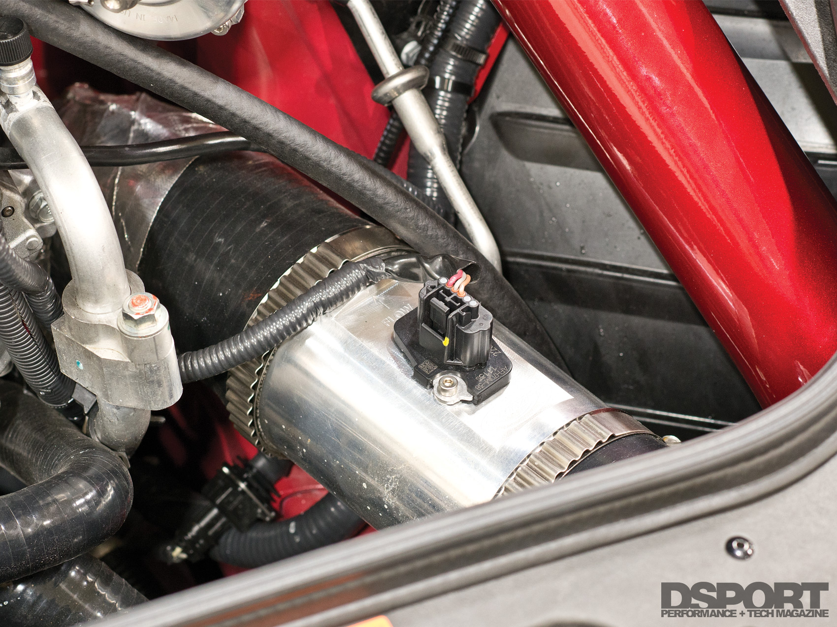 With horsepower targets in excess of double the factory output in mind, the VR38 would require more fuel and more boost to hit its mark. A Switzer R1K X fuel delivery system employs a third fuel rail to deliver a total of twelve R1K-X injectors. The dozen squirters ensure adequate supplies of VP Racing Q16 race fuel reach the combustion chambers. A Syvec S8 engine management system regulates all aspects of engine management. Using the S8 to regulate boost pressure from the twin Switzer modified Garrett GT35R based turbochargers to a maximum of 35 psi, the GT-R generated a staggering 1,272 horsepower and 1,008 lb-ft torque to the rollers of the Mustang AWD dynamometer of Buschur Racing.