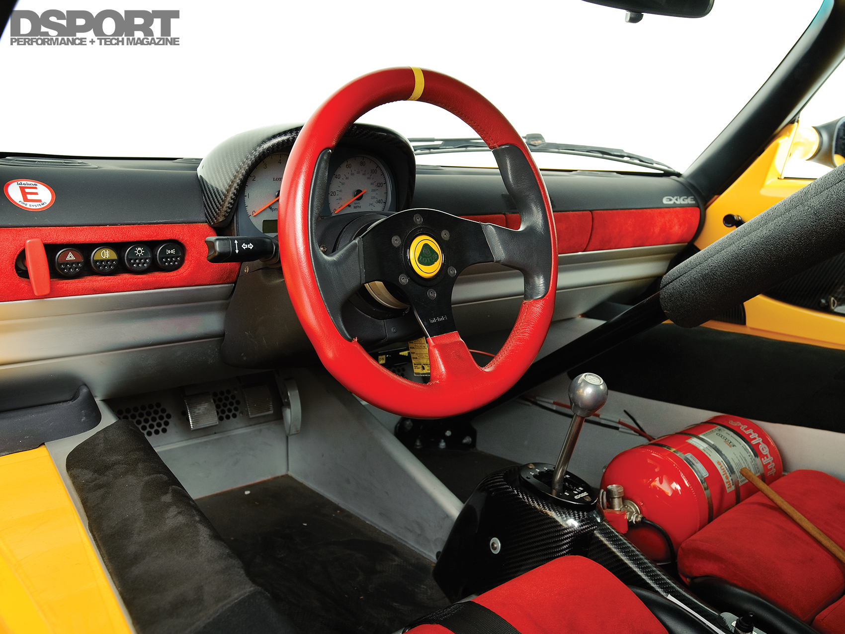The interior of the car essentially remains the way Lotus designed it with sport buckets, roll bar and fire suppression system. Every component is designed for lightweight function over form. Even the dash hosts nothing but the bare essentials. No space or weight is wasted for amenities like temperature control ducts.