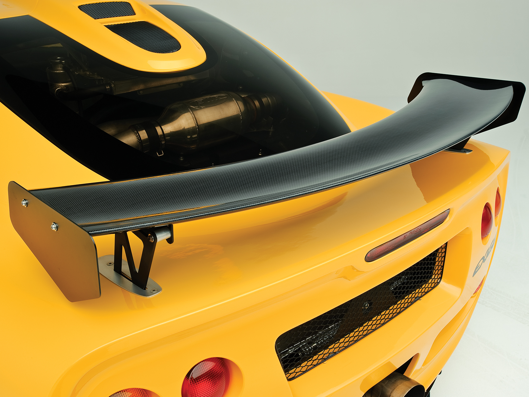 The exterior of this Exige received refinement with a new carbon-fiber roof scoop, side-intake sills and rear wing. These enhancements portray a more menacing appearance while improving aerodynamic function.