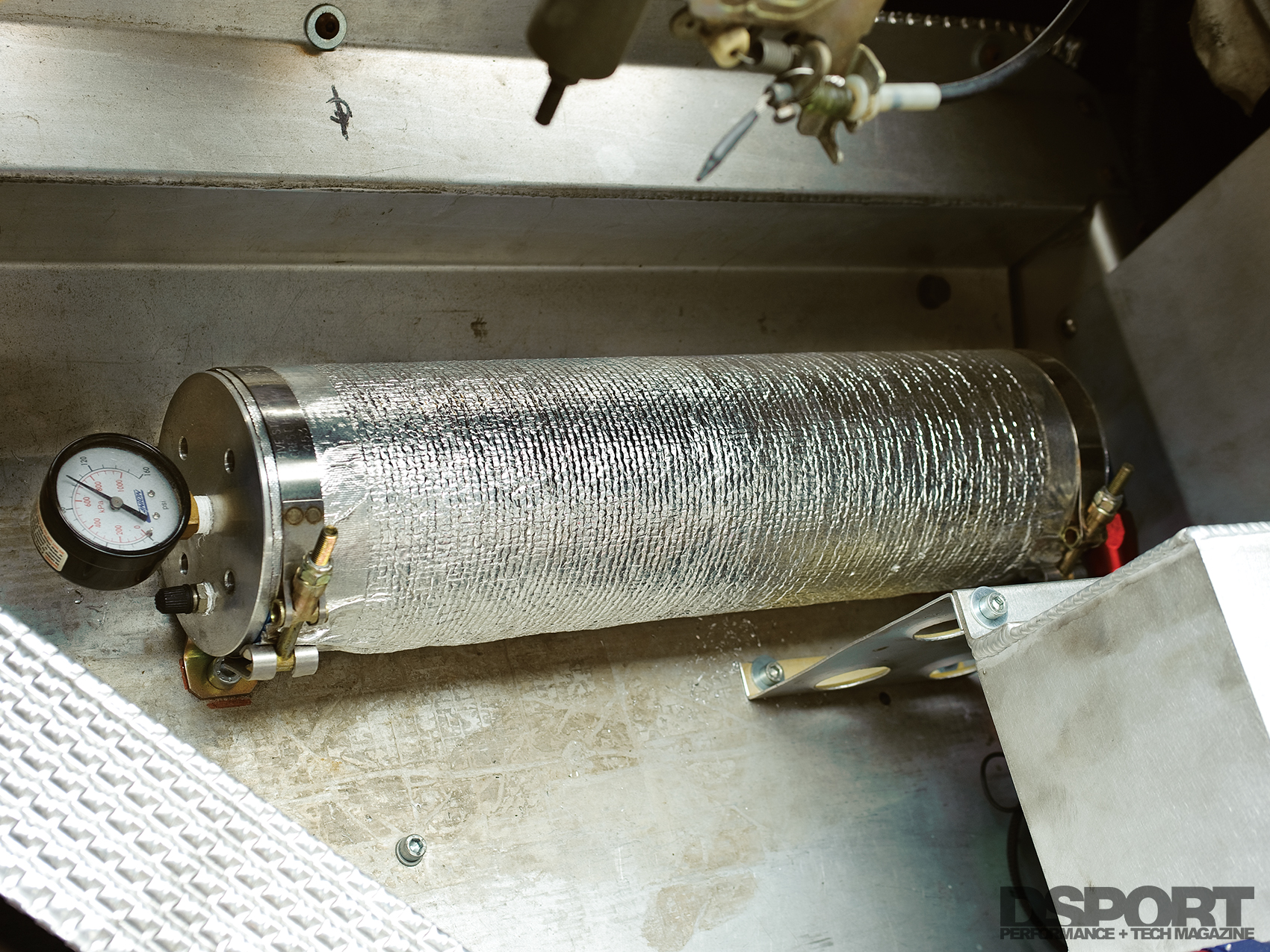 The Rotrex supercharger’s air-to-water intercooler and supporting heat exchangers conceal the Honda motor underneath. One exchanger is used to cool the intercooler water while the smaller black one cools the supercharger’s oiling system.