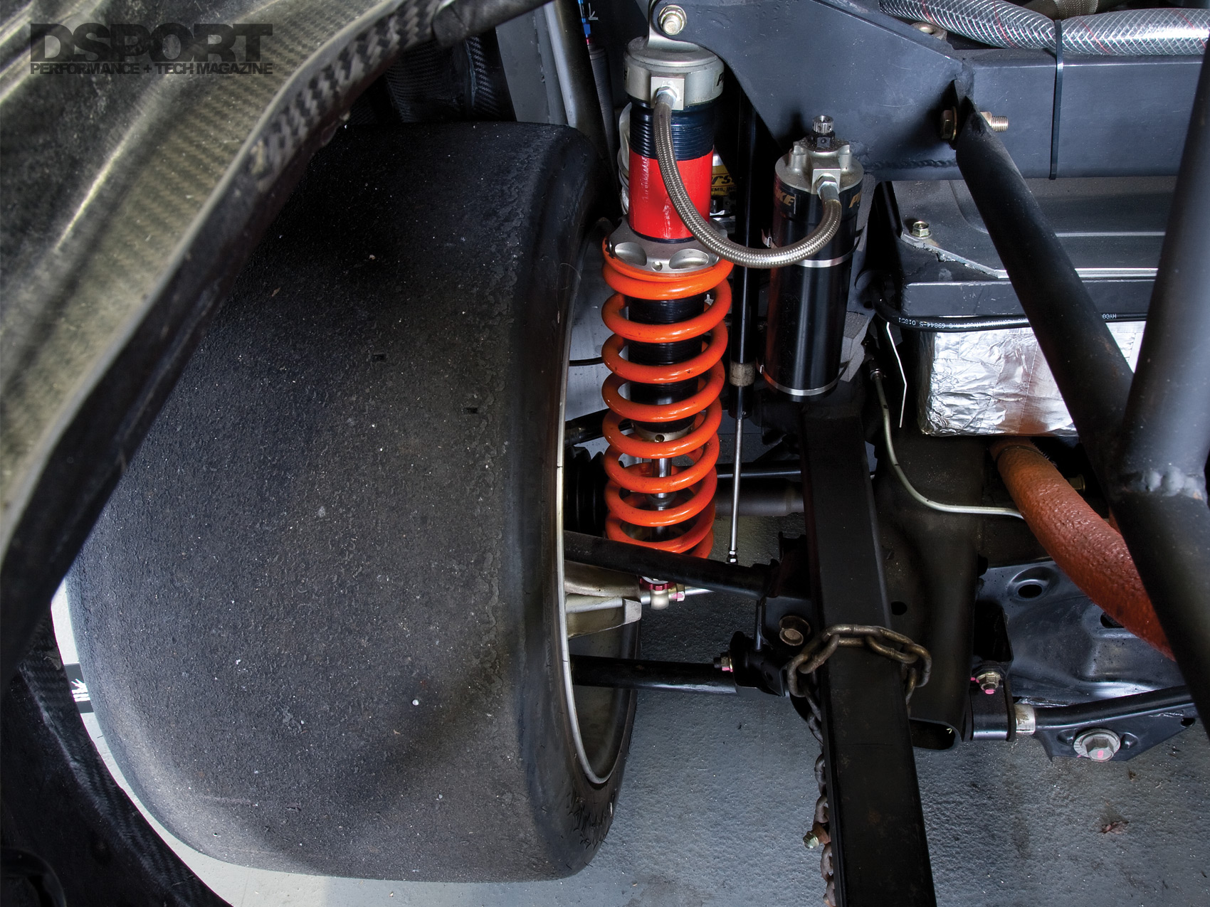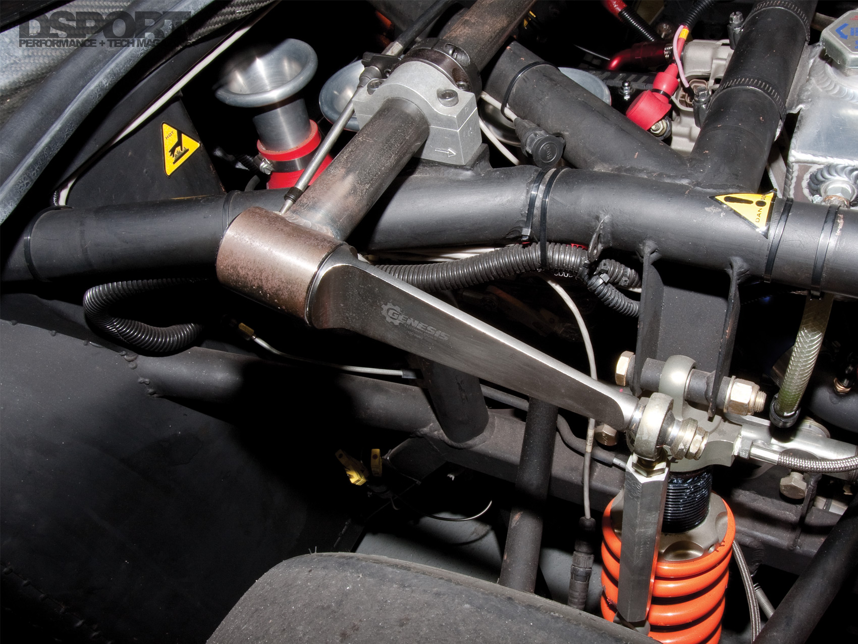 With the completion of the frame, work proceeded on the suspension design. The double-wishbone independent-suspension pieces join the chassis at ideal pickup points to enable the best possible alignment for optimal handling. A Genesis adjustable sway bar complements the front suspension, further improving steering response. Penske 3-way coil-over dampers provide shock absorption at all four corners, while Vogtland springs carry the weight of the chassis. The chassis rolls on a set of Forgeline 18-inch racing wheels wrapped with super-wide Hoosier racing slicks for maximum contact with the track surface. A set of Outlaw 4000 4-piston brake calipers squeeze Hawk Performance brake pads to bleed the speed before corners. Two-piece 13-inch vented rotors provide a large friction surface and dissipate heat to battle against brake fade. Ensuring proper modulation, a Tilton Engineering pedal set delivers hydraulic pressure to the brake calipers through Goodridge steel-braided brake lines. A Tilton Engineering proportioning valve, mounted next to the steering column, enables the driver to make brake-bias adjustments on the fly.