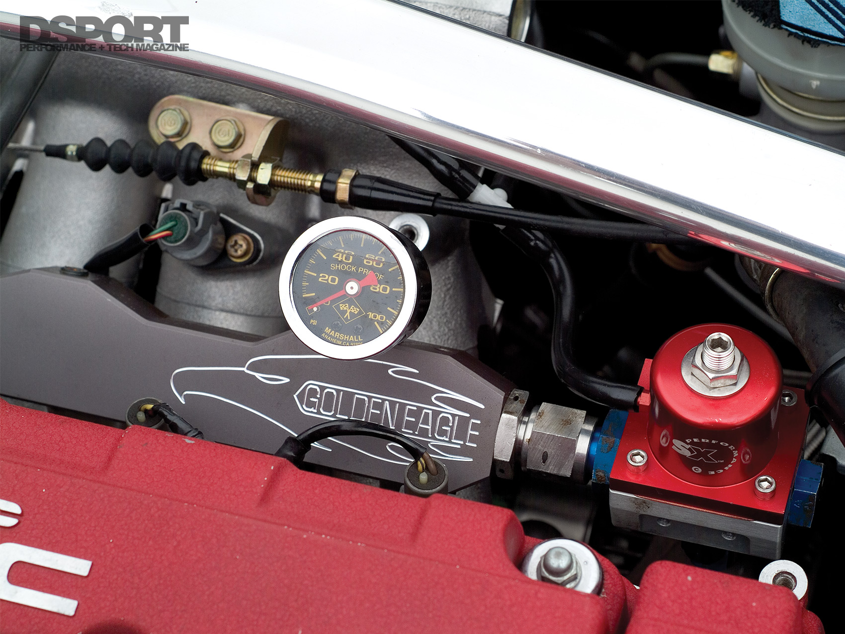 As all the parts were coming together for the turbo system, the team shifted their attention to the fuel delivery system and engine management department. Fuel is pushed from the tank by a Walbro 255 liter/hour high-pressure in-tank fuel pump and makes its way to a Golden Eagle fuel rail to be sprayed by a quartet of RC Engineering 750 cc/min fuel injectors. An SX Performance FPR regulates fuel pressures to the rail. As the engine was being prepared for 20+ psi of boost pressure, the ignition system had to be upgraded as well. A MSD 6A ignition box was wired in along with an MSD Blaster Coil and MSD spark plug wires. For tuning, a Hondata s200b engine management system made its way to Rawgie’s sedan.