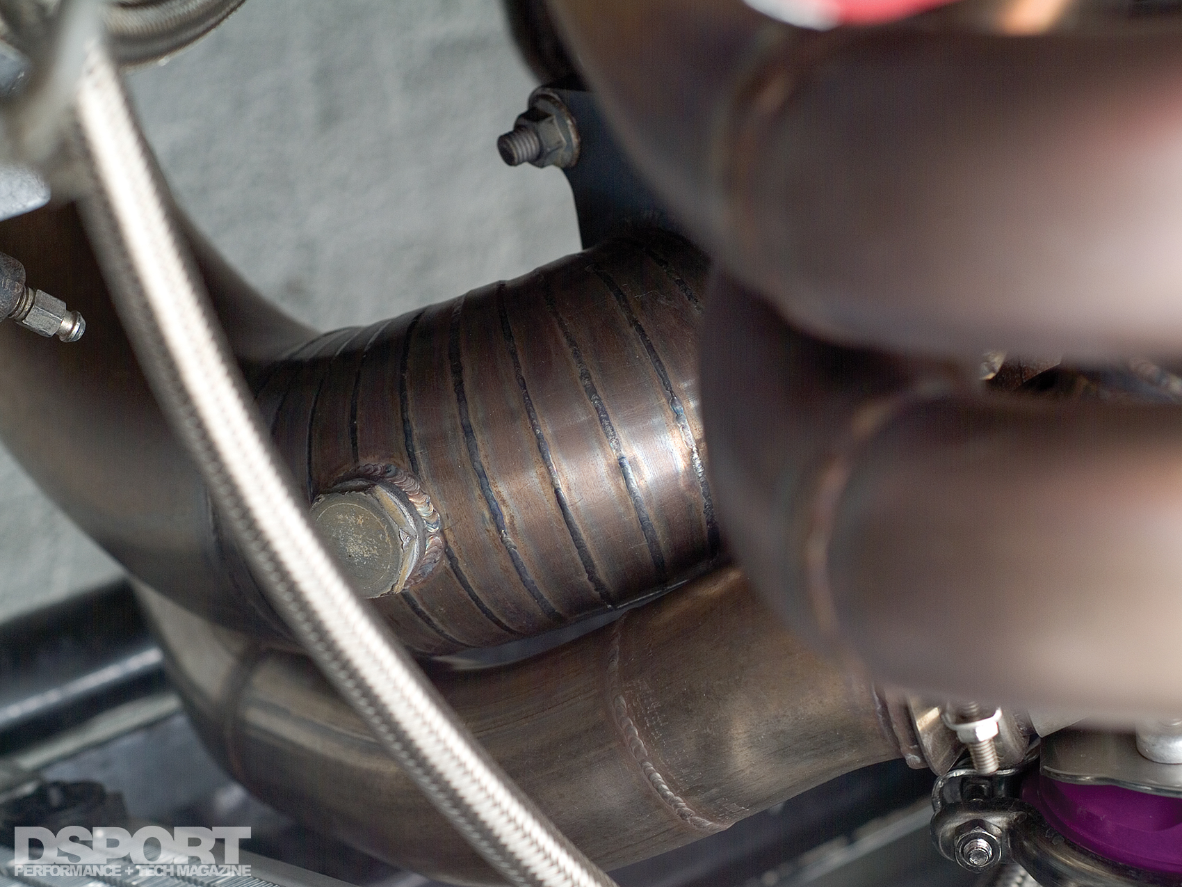 As John finished assembling the boost ready engine, Rawgie pieced together a turbo system of his own with the help of Fred, Adam and Tony of Evolution Racewerks. A Full-Race Motorsports equal length exhaust manifold was used to hang an Innovative Turbo Systems GT35R turbocharger. Regulating boost pressure away from the turbine, the crew opted for an HKS GTII 60mm wastegate. Charge air makes its way to a PWR Performance intercooler and then through Evolution Racewerks custom intercooler piping. On the hot side, wasted exhaust gas exits through an Evolution Racewerks downpipe and is taken out back by a custom Thermal Research Development exhaust system.