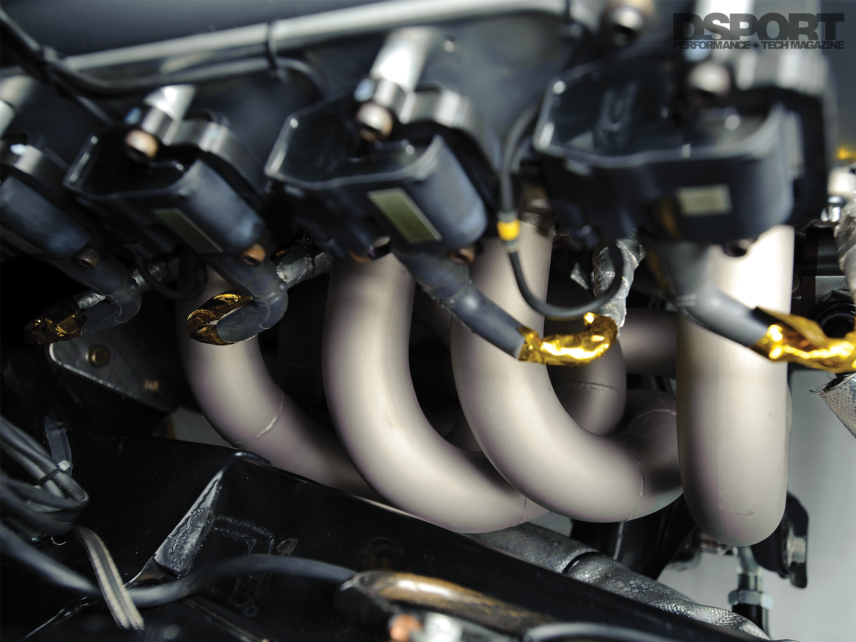 (L) With the dash removed, the Tilton pedal set, AEM EMS, wiring and switchgear can be accessed for maintenance. (R) The headers were custom built with tuned-lengths to optimize the powerband.