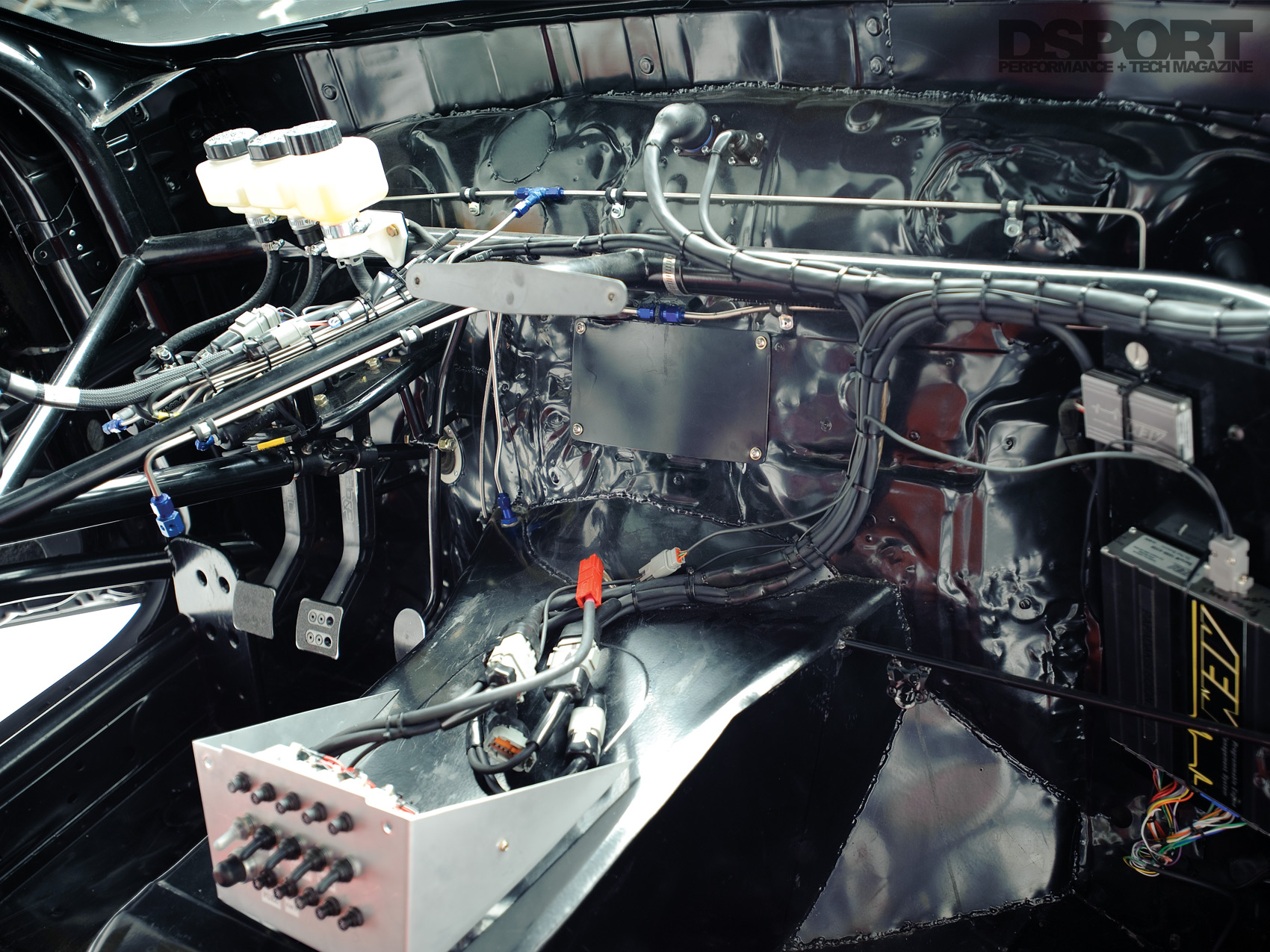 (L) With the dash removed, the Tilton pedal set, AEM EMS, wiring and switchgear can be accessed for maintenance. (R) The headers were custom built with tuned-lengths to optimize the powerband.