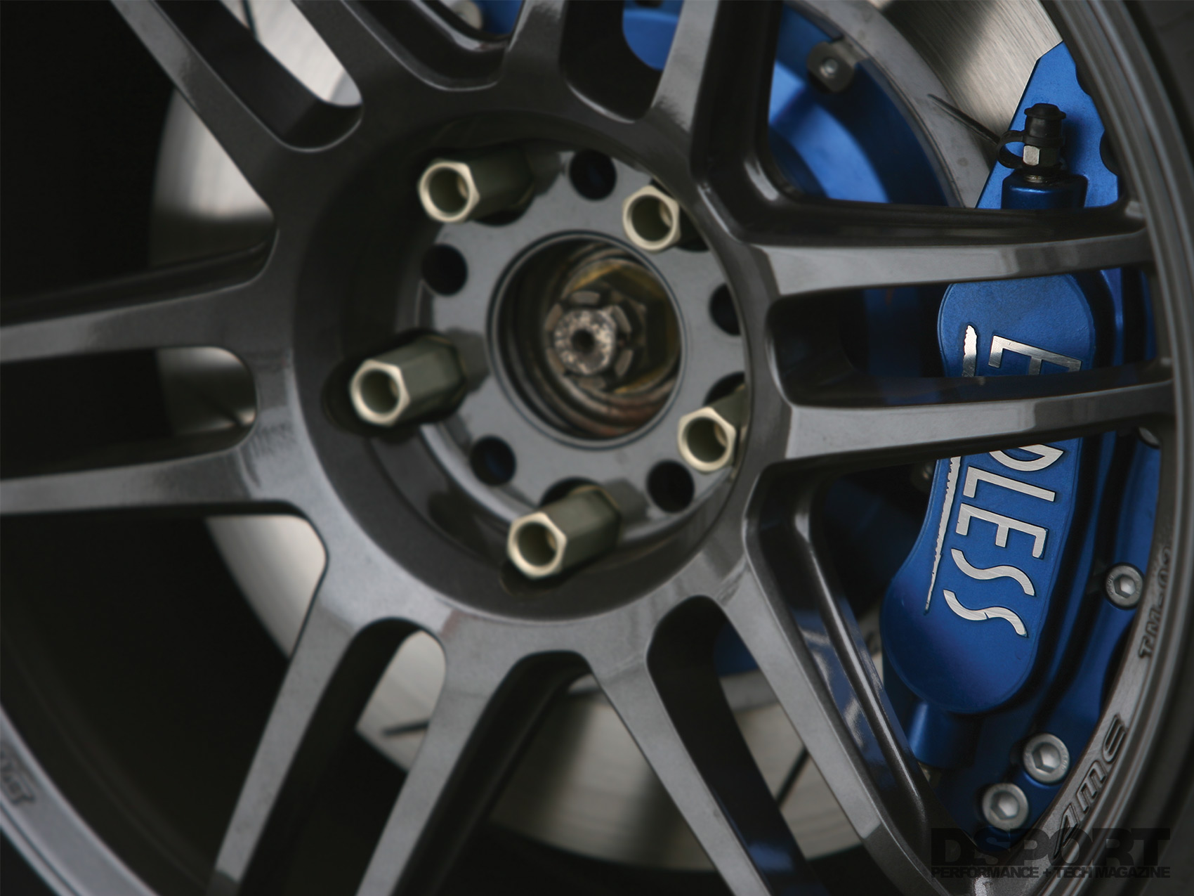 The next step was to fill the wells with the rubber. 18×10.5-inch AME TM-02 wheels took up residence at all four corners. These aluminum rollers were mounted with Toyo R888 high-performance gumballs in a 275/35R18 offering for maximum hookup on the track. To shave speed, Endless 6-piston calipers up front and 4-piston calipers in the rear clamp down on Endless 2-piece rotors and pads, generating the necessary friction before the turns. Finally, a set of Endless stainless-braided lines were installed to further enhance brake response and feel.