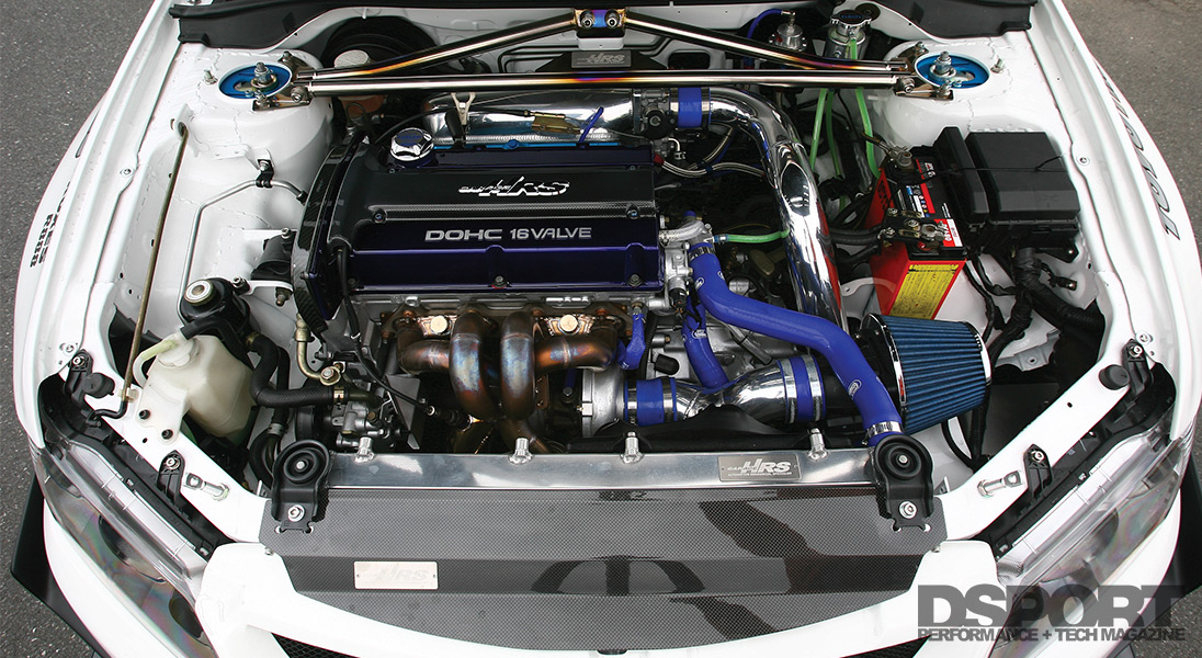 Garage HRS looked to realize additional torque and turbo response from the 4G63 powerplant. The solution was to increase the engine’s displacement with larger bores and a longer stroke. Garage HRS increased the cylinder diameter of the 4G63 iron-block by +1mm to 86mm before slugging the block with Power Enterprise 9.0:1 forged-aluminum pistons. The pistons make the connection to the Power Enterprise billet-steel 94mm stroker crankshaft by way of Power Enterprise forged-steel connecting rods. This combination of parts results in a new displacement of 2,184cc. In order to take advantage of the increased displacement, the cylinder head’s flow needed to be improved. Garage HRS ported and polished the head for improved air flow before filling the head with Cosworth valve springs and longer-duration 272-degree camshafts. A Power Enterprise head gasket was chosen to ensure a positive seal between the head and the block.