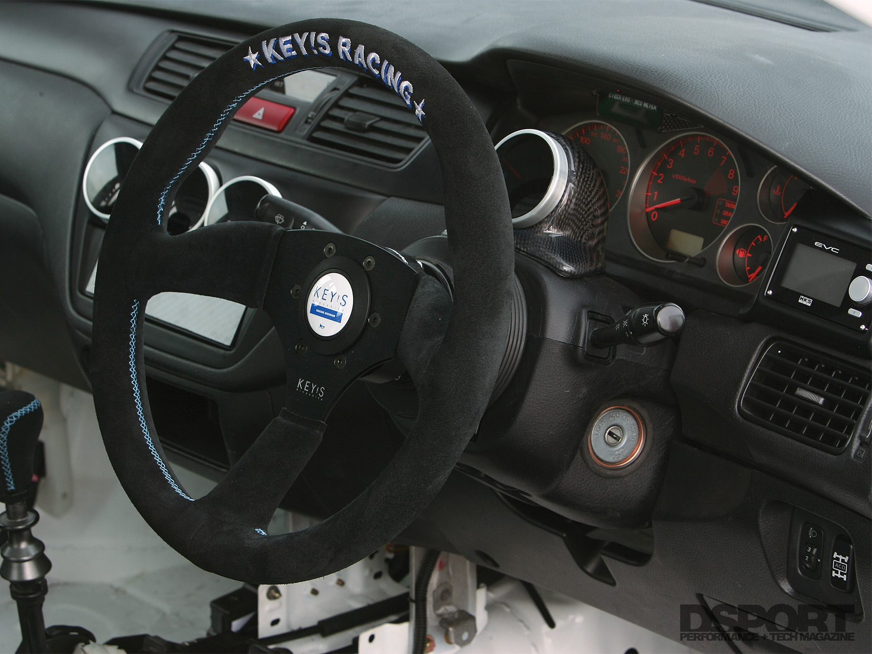 Moving to the interior, the purpose-built cabin was outfitted with a pair of BRIDE race buckets and Takata 4-point harnesses. In the center console, the absent A/C controls had been replaced with DEFI gauges while the HKS EVC boost control display sits neatly to the right of the gauge hood. Steering input and gear selection are now made through a Key’s Racing steering wheel and shift knob, giving the driver suede control surfaces for sure-handed grip.