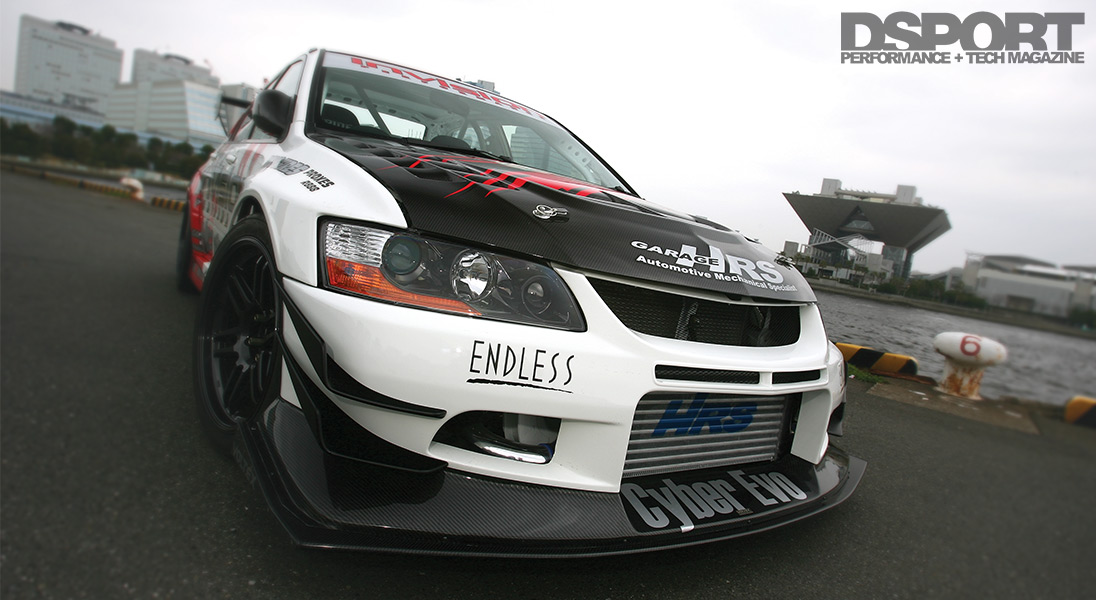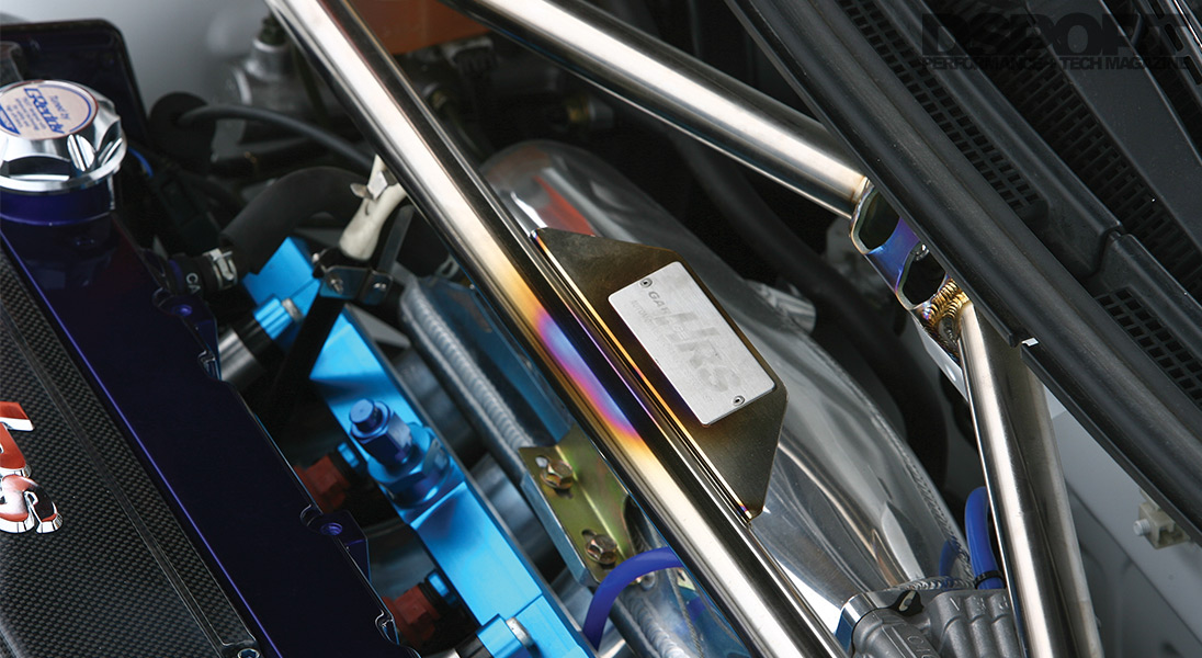 With the chassis and body prepared, attention turned to footwork. Suspending the chassis over the asphalt while retaining the best handling required filling the wheel wells with top-notch components. To start, ZEAL adjustable coilovers with custom valving and Garage HRS-spec springs position the EVO IX at the ideal ride height. The added width of the wide fenders facilitated the use of Cyber Evo’s +25mm wide-track kit. The kit, which includes extended arms and tie rods, improves the EVO IX’s handling and allows the use of the widest possible wheel- and-tire combination. The suspension was further supplemented with Cusco’s front stabilizer bracket and rear adjustable stabilizer. Tying in the front shock towers, a Garage HRS titanium strut tower brace was bolted in for added rigidity.