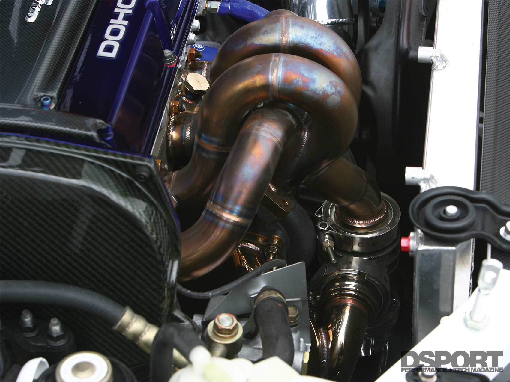 With the longblock completed, the focus shifted to making boost pressure. Garage HRS chose a Power Enterprise RX-6 turbocharger. This IHI TCW77L-P22-spec turbo is identical to the turbos that were used by Honda’s Formula One race team. This is also the same turbo used on the record-setting Cyber EVO. The RX-6 turbo receives high-enthalpy exhaust gases by way of Power Enterprise’s stainless- steel equal-length manifold. Once the gases leave the turbine housing, they flow through a Power Enterprise stainless-steel downpipe and Garage HRS titanium exhaust to the rear of the chassis. On the cool side of the RX-6, the compressor draws ambient air through a Power Enterprise intake and HPI cone filter. Once compressed, the charge air travels to the Garage HRS Super Intercooler. Once the heat is rejected at the intercooler, the cooler, denser air flows through a Garage HRS-modified throttle body. The +2mm greater diameter of the modified throttle body permits increased airflow into the Garage HRS aluminum intake manifold. As the incoming air reaches the combustion chambers, Power Enterprise 1,000 cc/min fuel injectors spray 105-octane fuel into the air stream. Fuel reaches the injectors by way of a custom fuel delivery system. Garage HRS dropped in a Power Enterprise 255-lph in-tank fuel pump to supply the dual Bosch 044 in-line pumps and Garage HRS fuel surge tank. This combination of components helps to maintain steady fuel pressure no matter how aggressive the course or the amount of body roll the chassis experiences through the turns. Orchestration of fuel delivery and ignition timing sits squarely on the shoulders of HKS’ F-CON V-Pro engine management system. With the HKS EVC boost control set to 28 psi, Itoh tuned the V-Pro to generate 592 whp and 456 lb-ft of torque from the 4G63 mill.
