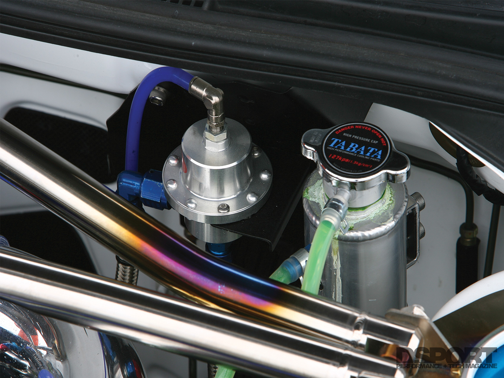 With 592 horsepower on tap, the stroked 4G63 generates a considerable amount of heat. To combat these extreme temperatures, Samco silicone hoses and an F-Win racing radiator replace the factory components as the primary means of heat exchange for the engine. An HKS low-temperature thermostat works in conjunction with the radiator to keep the heat down, while a Tabata air-separator tank keeps the cooling system running at optimal efficiency. An HKS oil cooler further supplements and completes the cooling system.