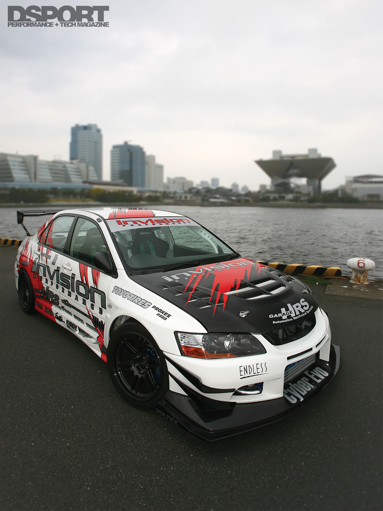 Invision Performance recruited the assistance of fabricator Johnny Itoh of Weld Techniques Factory and EVO-specialist Yoshihiro Hirayama of Garage HRS fame to help with the construction of this no-holds-barred build. The work began on this 2006 EVO IX by stripping the entire chassis to a bare shell. Once the sound deadening had been removed, Itoh flexed his welding skills by fabricating an SCCA- and NASA-certified 8-point cage to reinforce the cabin, protect the driver and add rigidity to the chassis. Itoh also stitch welded the panels for added stiffness before moving to the exterior.