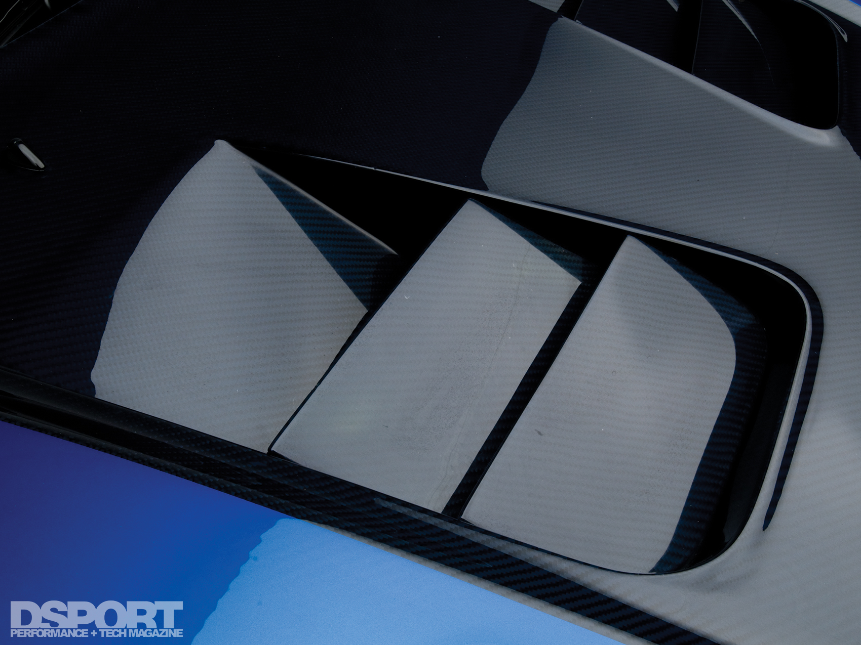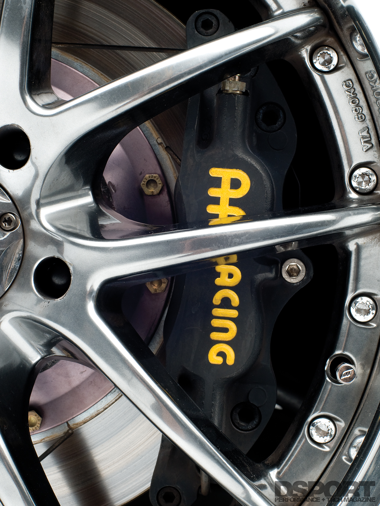 The factory body lines of the Acura NSX shout for attention. In a town of glitz and blitz, even a stellar factory appearance was not enough. To lower the stance of the NSX, HKS Hipermax II adjustable coilovers were fitted to the four corners. A Carbing rear shock tower brace and factory Honda NSX-R chassis brace tie in the critical flex points on the chassis, allowing the coilover suspension to work at top efficiency.
