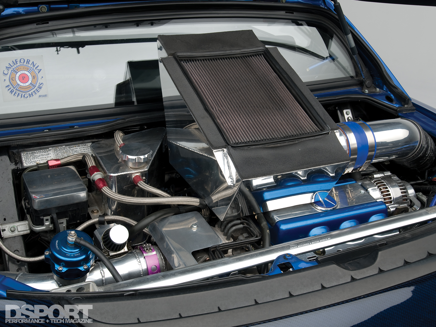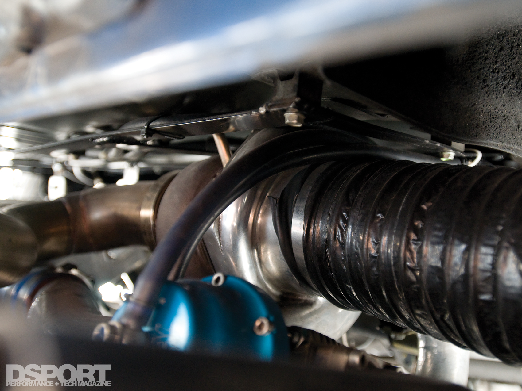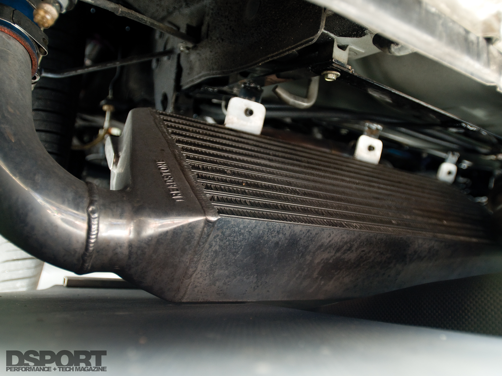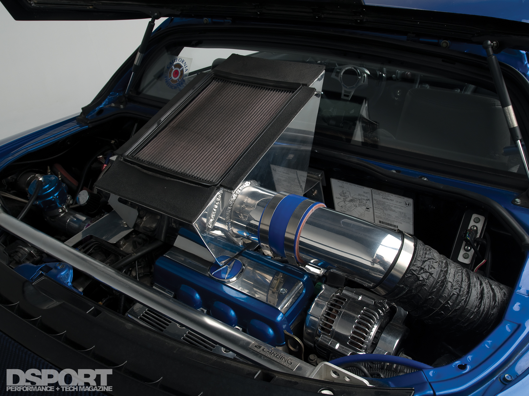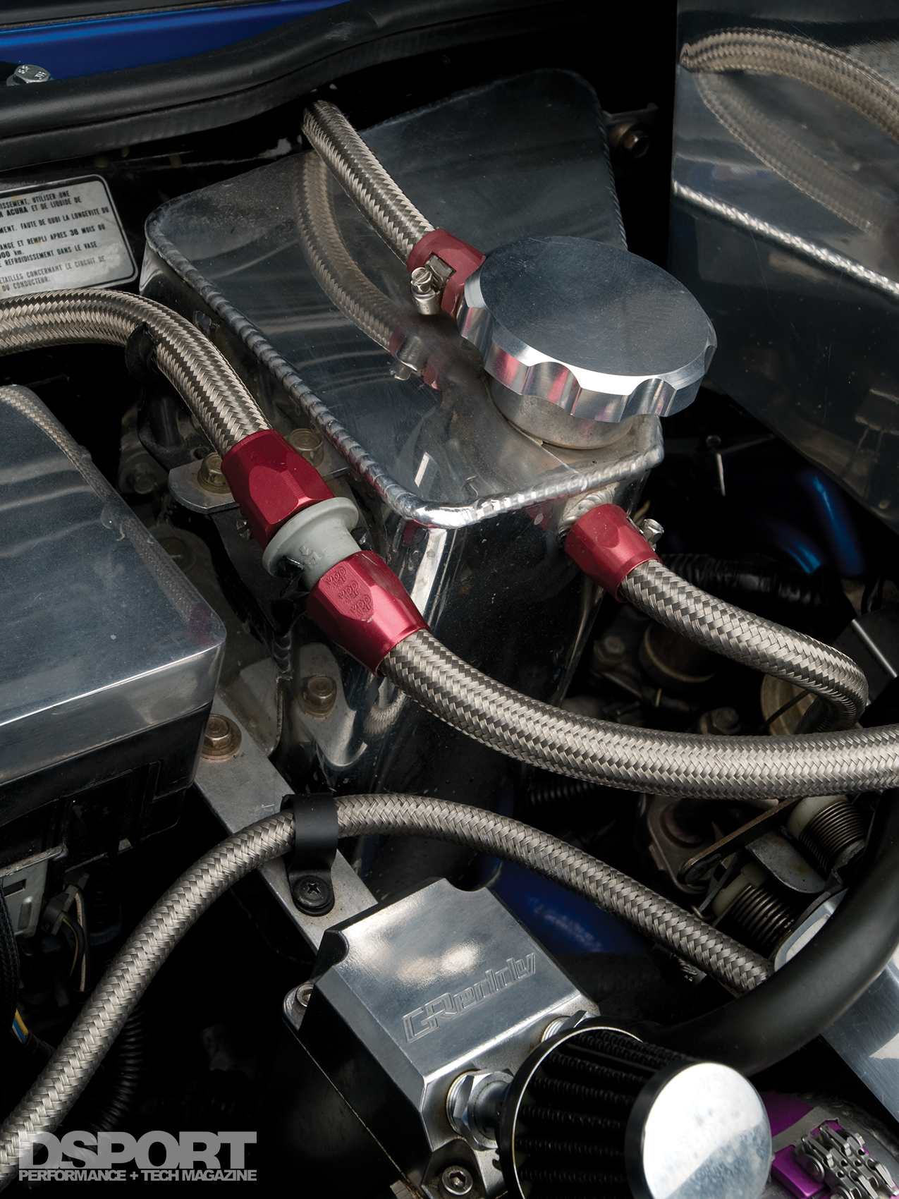 With the block completed, attention shifted to creating boost. Aiming for at least 500 horsepower, a Science of Speed (SOS) exhaust manifold was chosen to direct exhaust gases into the turbine of the Garrett GT3582R turbocharger. From the turbine outlet, Factor X fabricated a custom stainless-steel exhaust system finished with a pair of Burns Stainless mufflers. The compressor of the GT35 draws cool air from the custom roof-mounted air induction system. Once compressed, the air charge is forced through custom piping to the Spearco rear-mount air-to-air intercooler. After the intercooler, the chilled air is channeled to the Factor X-modified intake manifold. As the compressed air is divided between the intake ports, a half dozen 720 cc/min RC Engineering fuel injectors deliver a 50/50 cocktail of 91- and 100-octane fuels to the combustion chambers.