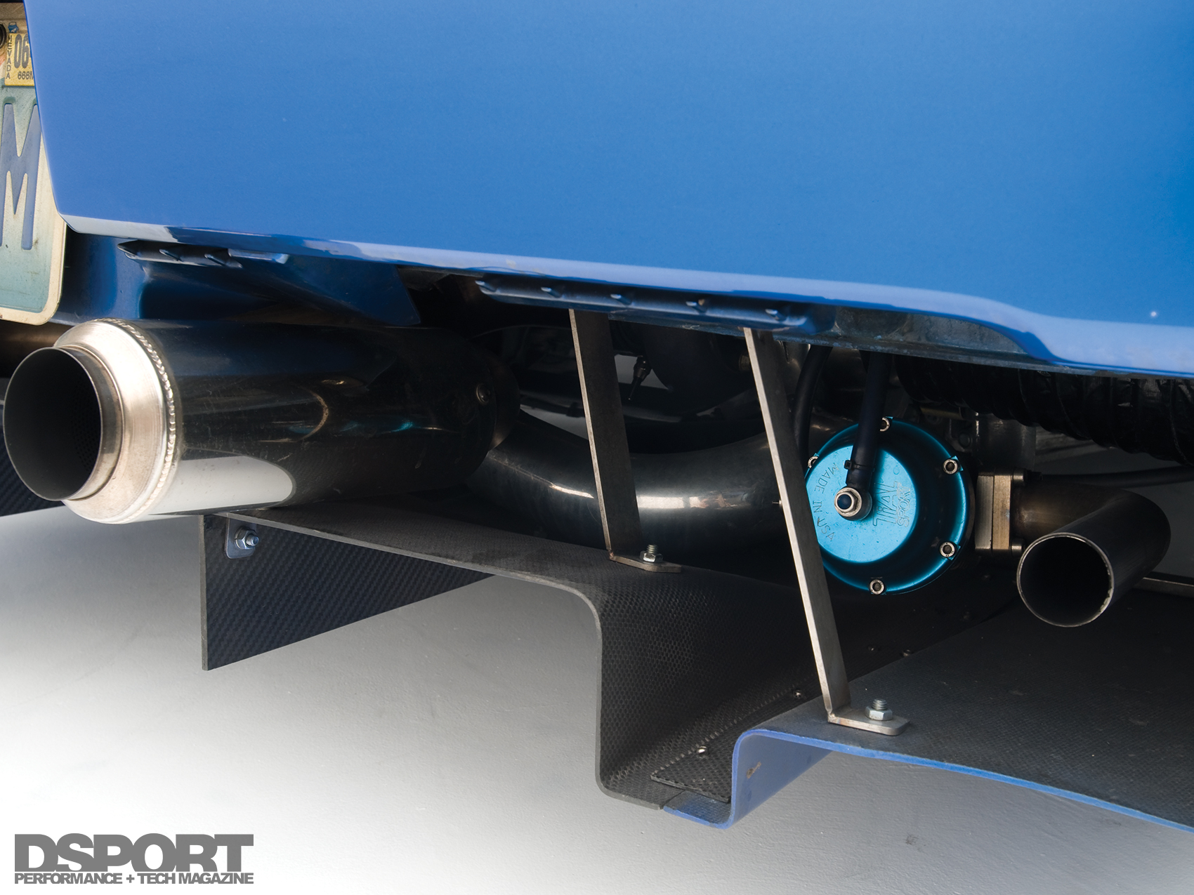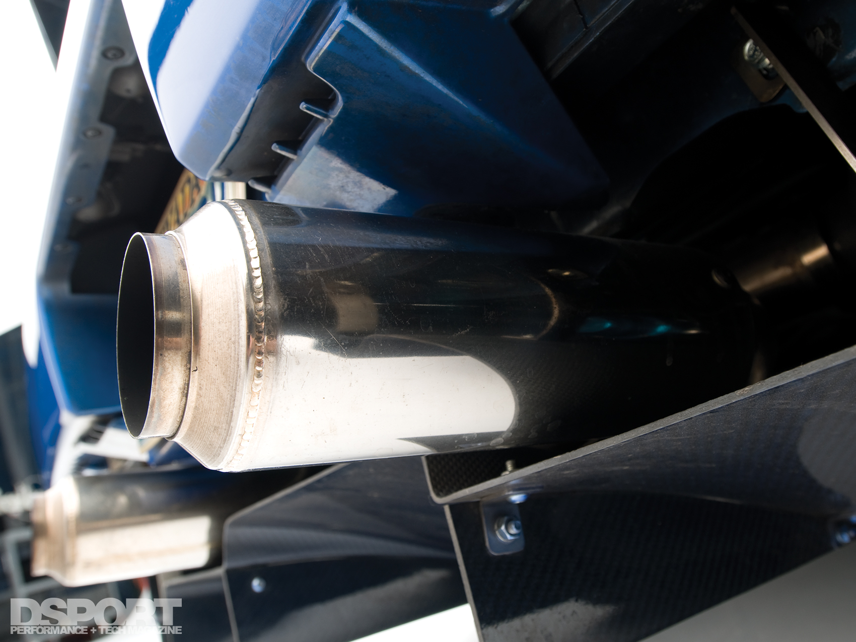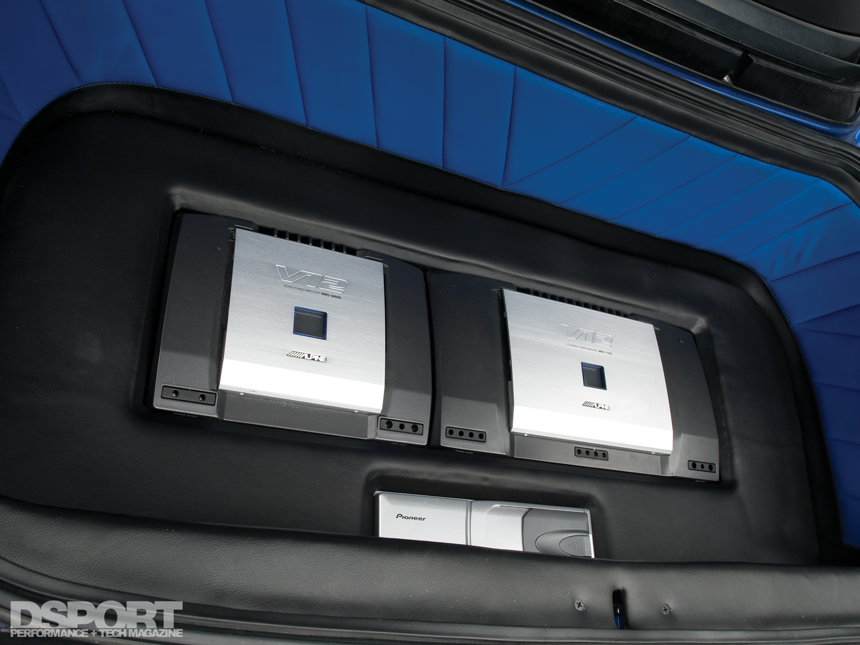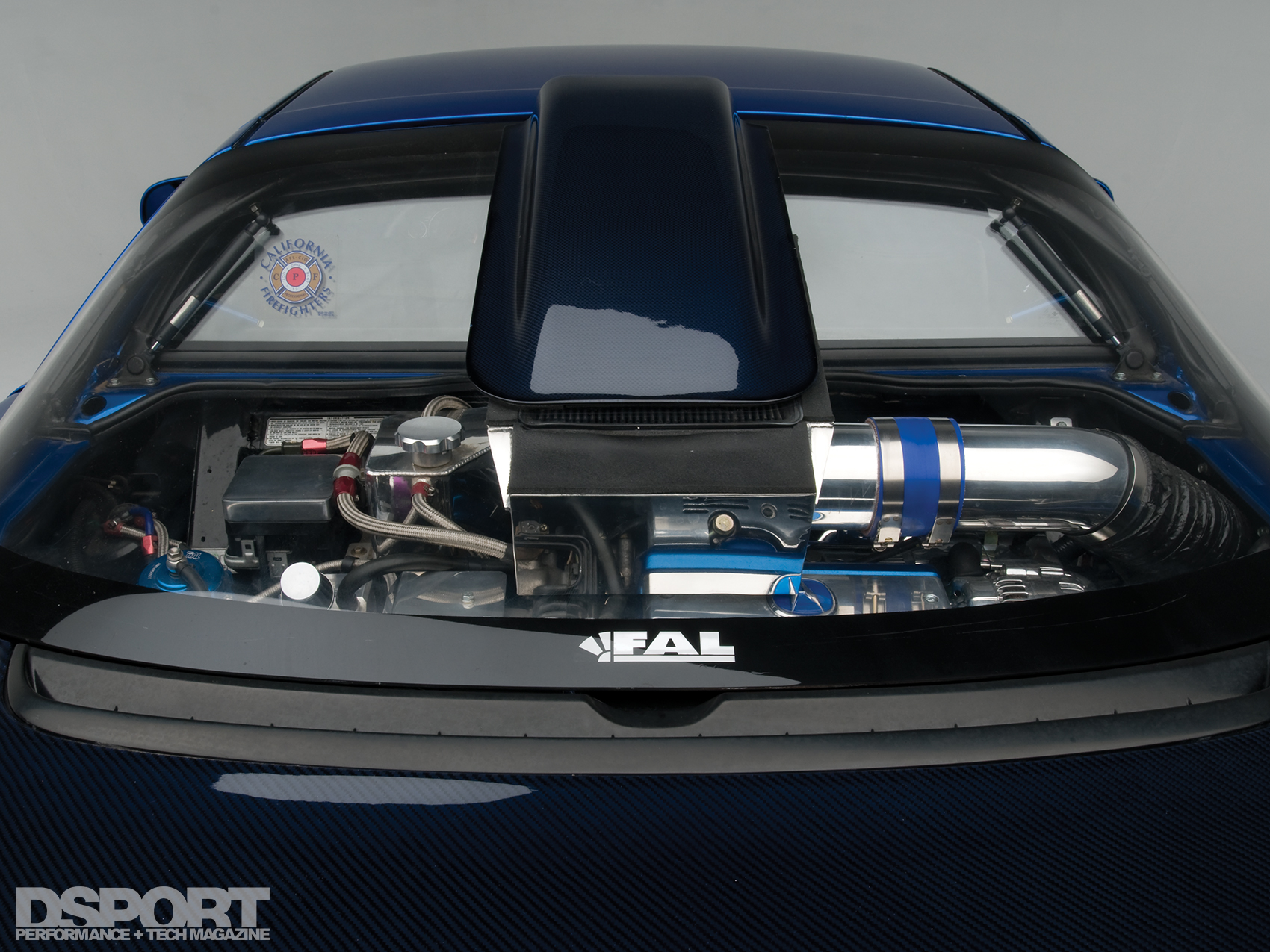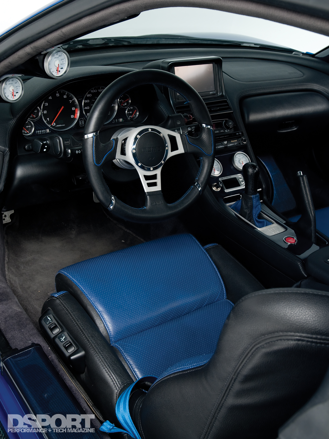 The cockpit of this demon features custom-upholstery and a Dali Racing roll bar for safety. Sabelt 4-point harnesses mated to a SOS harness bar secure the occupants while a host of DEFI gauges keep Paul up to speed about his engine’s vital signs. Steering input is handled by a Momo steering wheel. For those long sessions in “Strip” traffic, a Pioneer DVD head unit backed by a pair of Alpine V12 amplifiers drives a host of Alpine speakers and a 12-inch subwoofer.