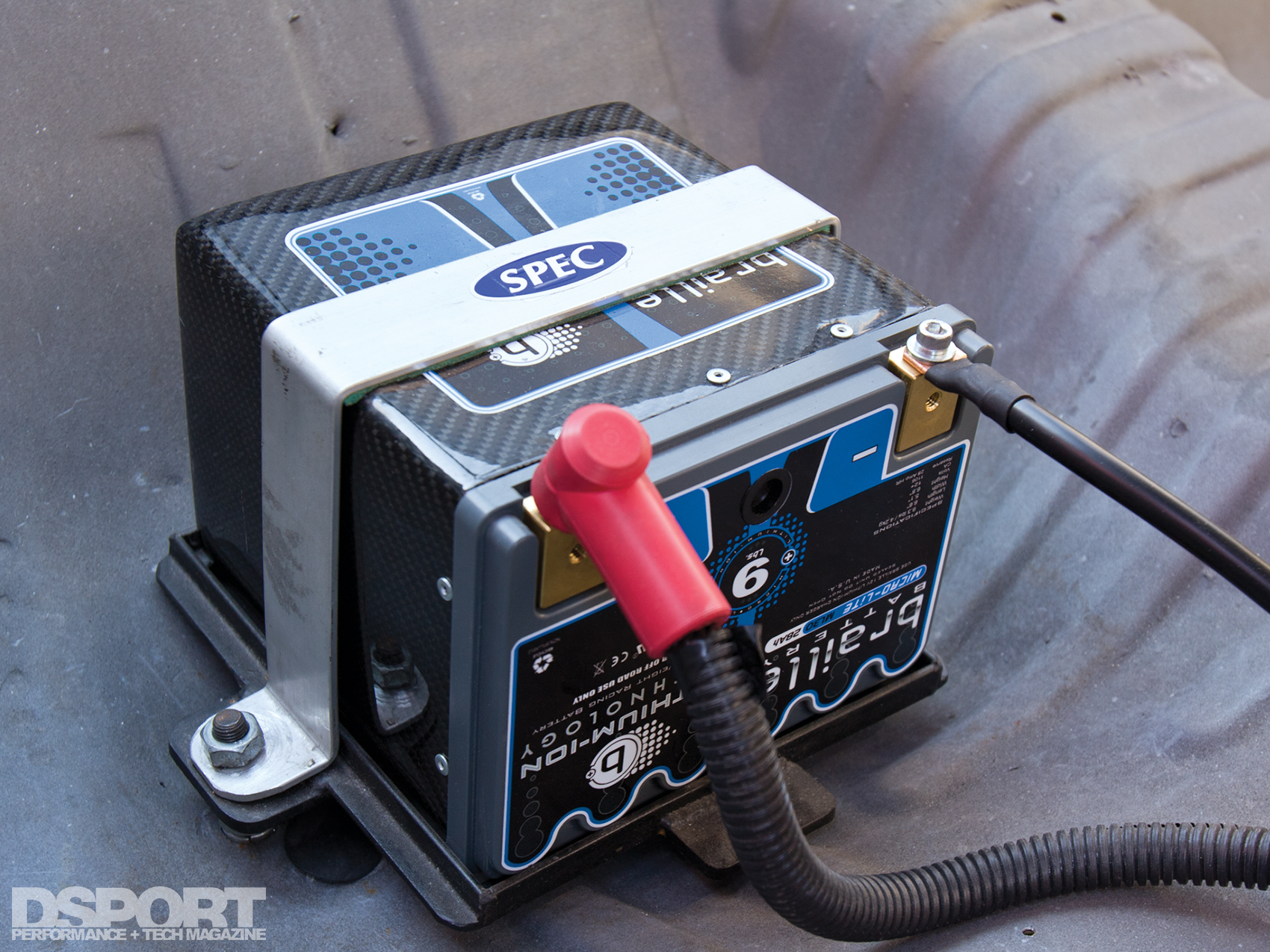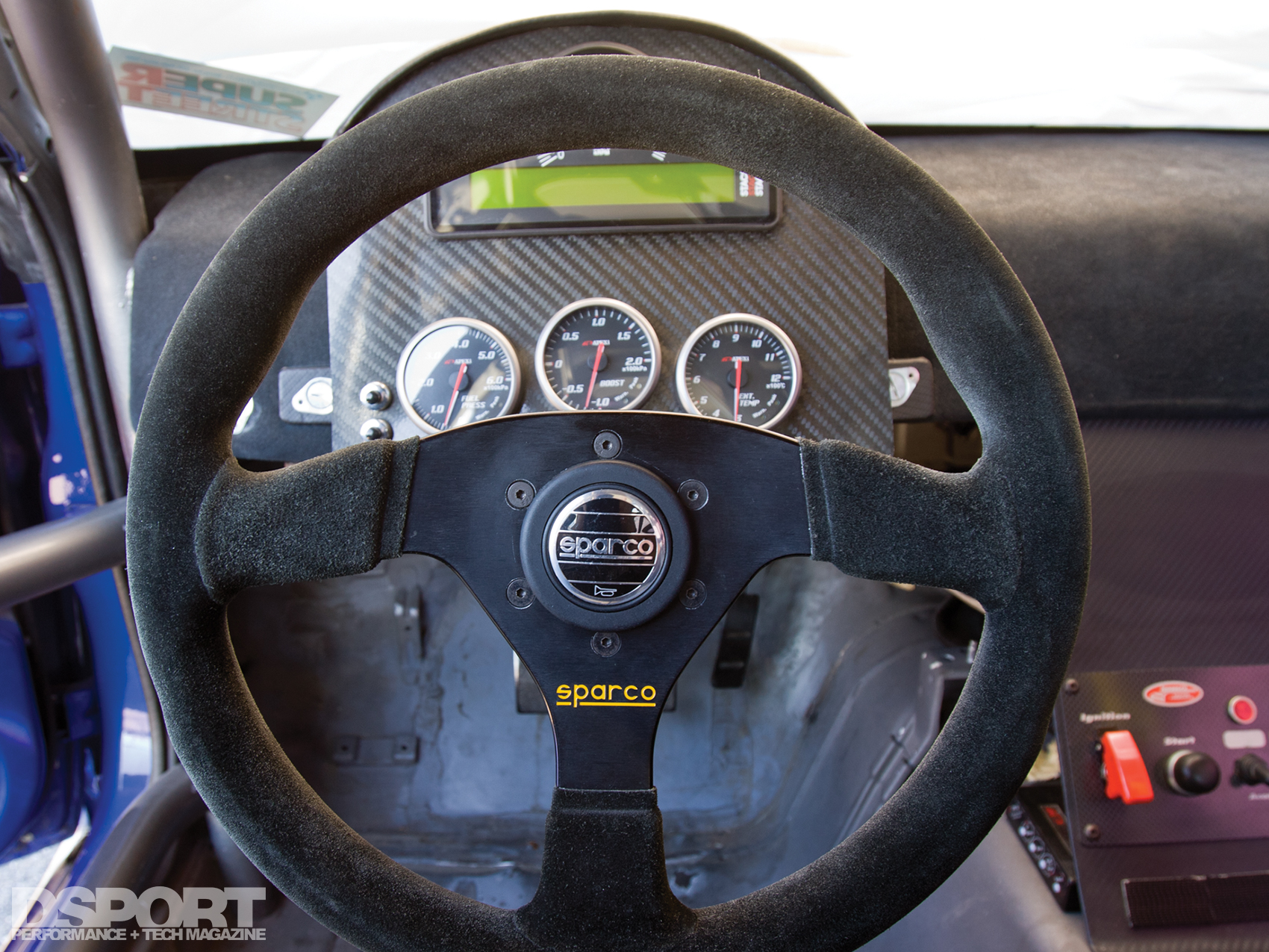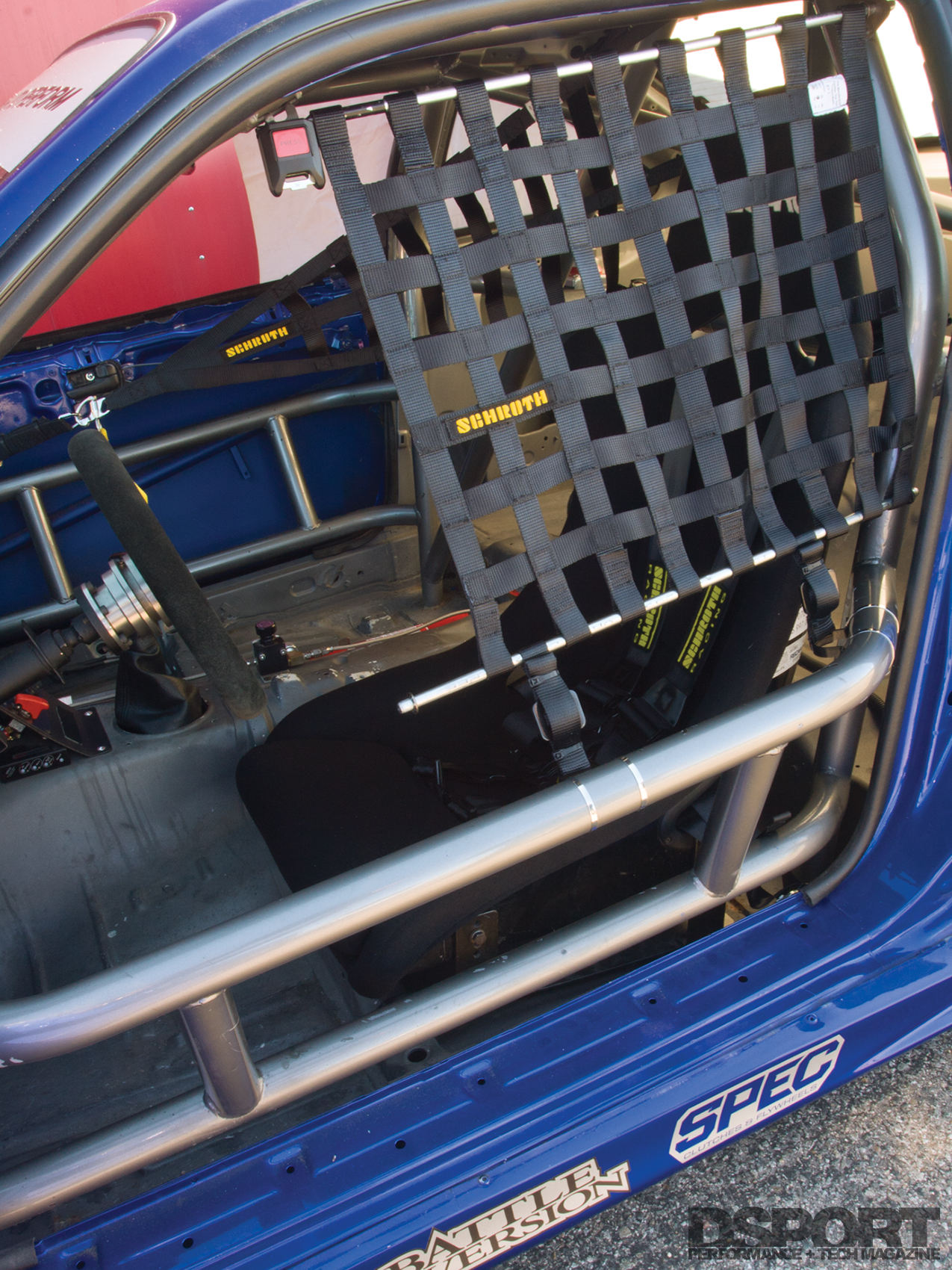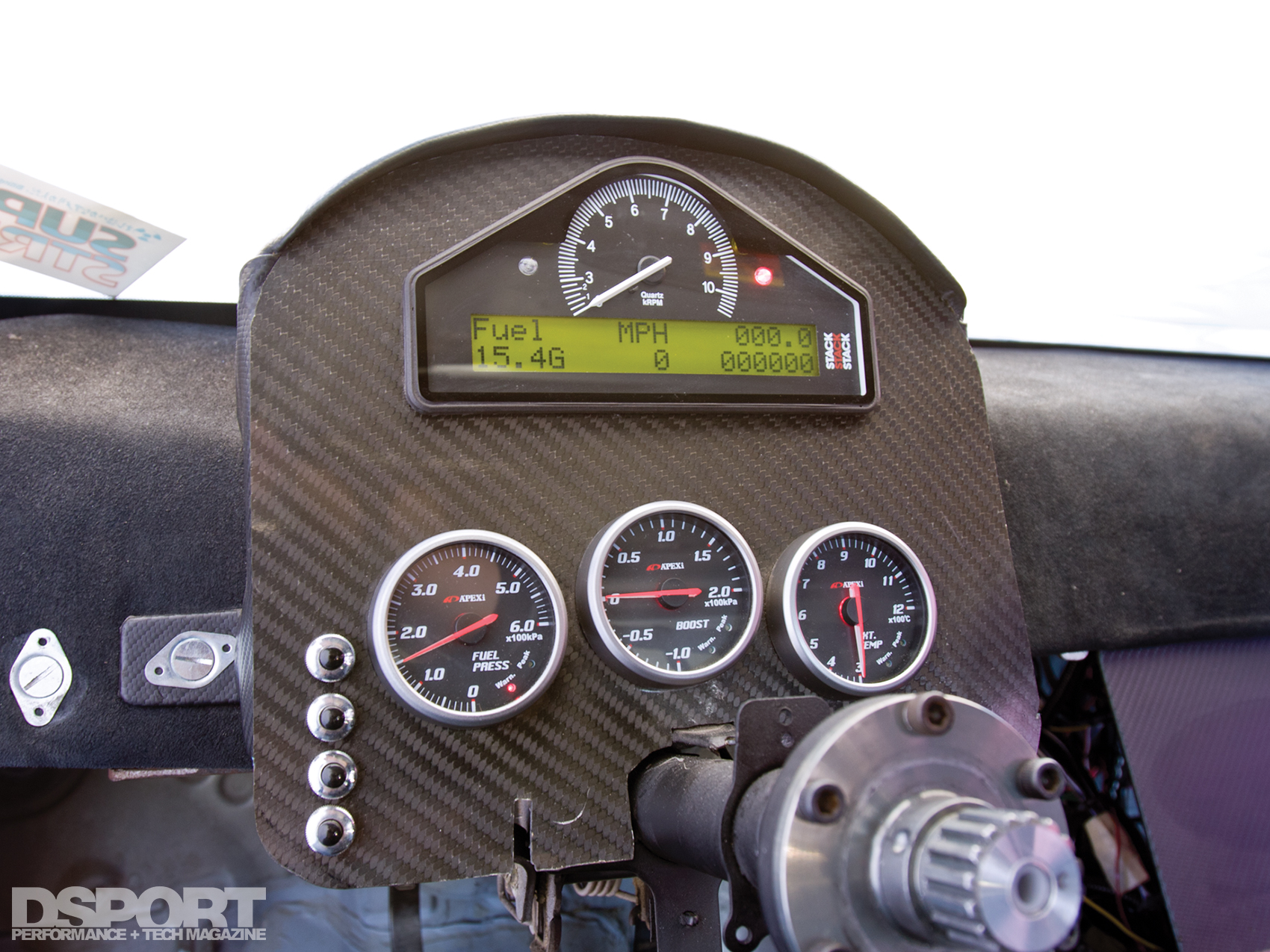 Although the chassis had already been prepared for the strip, it was back to the design board to make the setup more reliable and better prepped for the circuit. Once the chassis had been stripped and the doors gutted, the cabin was reinforced with a Kirk Racing cage better suited for door-to-door competition. The cage not only stiffened the chassis and offered protection for the driver in case of a rollover, it also featured door bars that protrude into the hollowed doors to ensure side impact protection. A Recaro Pole Position bucket seat with Schroth 6-point racing harnesses secures the driver behind the Sparco steering wheel. Information is critical, so a STACK display panel and A’PEXi gauges mounted to a carbon-fiber panel monitor engine vitals and relay important vehicle data. For weight savings and adjusted ballast, a Braille Battery lithium-ion battery with a carbon-fiber shell mounts behind the now- absent passenger seat.