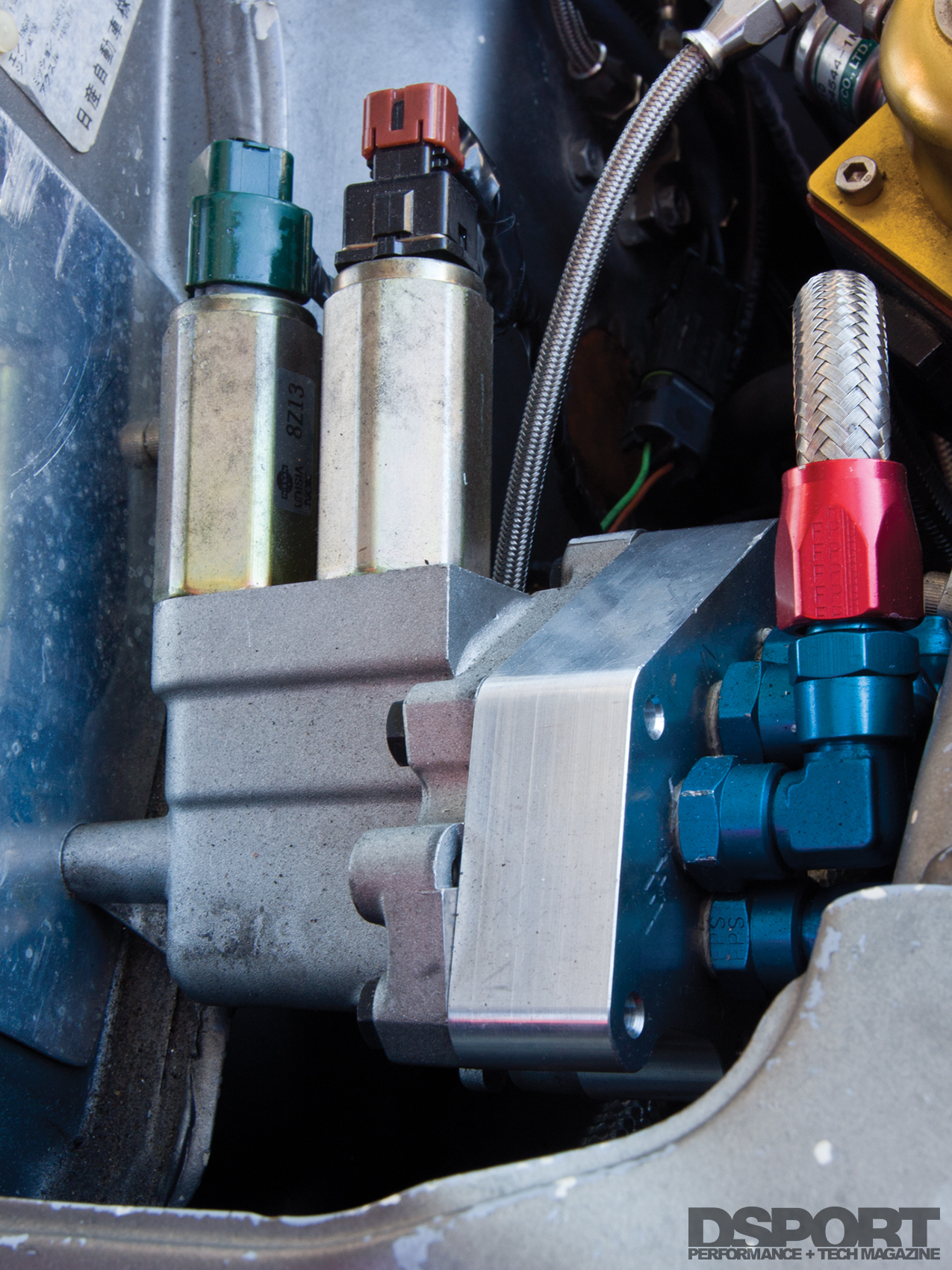 The original S13 SR20DET high-port cylinder head generally outflows the low- port, variable intake camshaft-equipped SR20DET from a JDM S14. However, neither can compare to a higher-flowing cylinder head with variable-valve timing and lift control on both the intake and exhaust camshafts. The Nissan SR20VE head offers increased airflow in addition to optimized valve timing thanks to dual variable camshafts. With the SR20DET high-port head removed, the SR20VE head installed in its place was equipped with a complete Supertech valvetrain lifted with the stock VVL camshafts. An A’PEXi MLS head gasket provides the seal between the head and block, while ARP head and main studs keep the long-block assembly together. Norton remarks, “The VVL install was not terribly difficult. We mounted a magnetic pickup on the timing cover and a crank trigger to the cam sprocket. The biggest deal was syncing the signal to the variable cam timing function in the AEM EMS. But it is nothing a good tuner can’t knock out.”