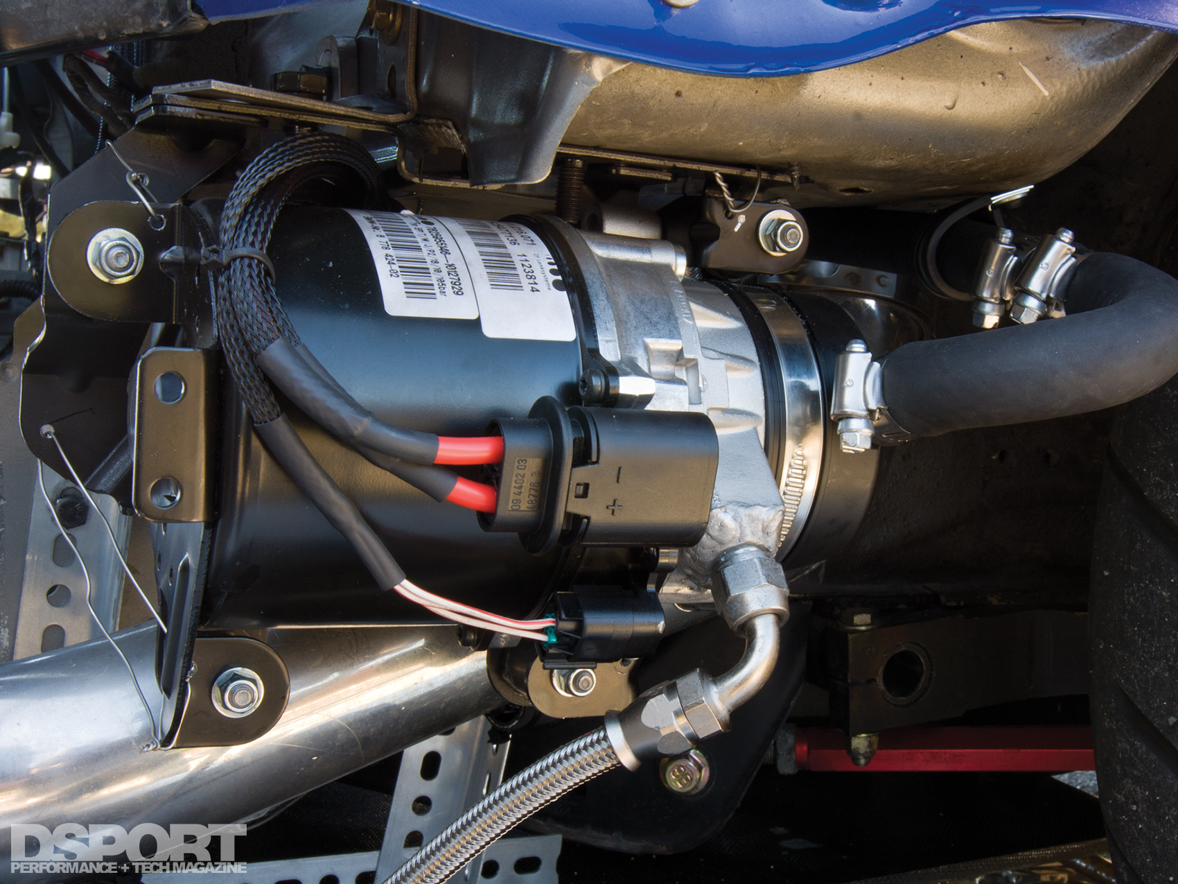 Road racing without power steering is just plain undesirable. Since the turbocharger occupied the crank-driven power steering unit’s location, an electric power steering pump was employed. This not only solved the power steering issue, it also reduced some of the parasitic draw on the engine.