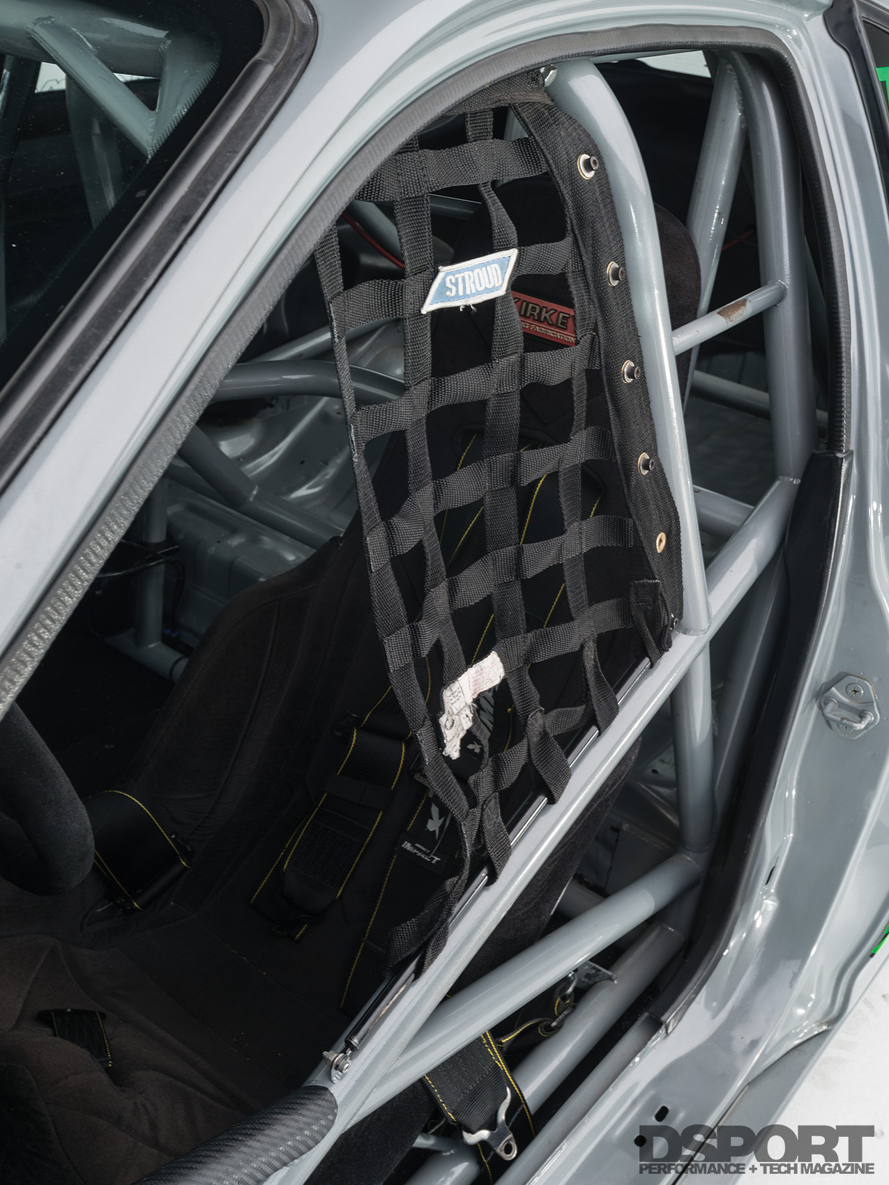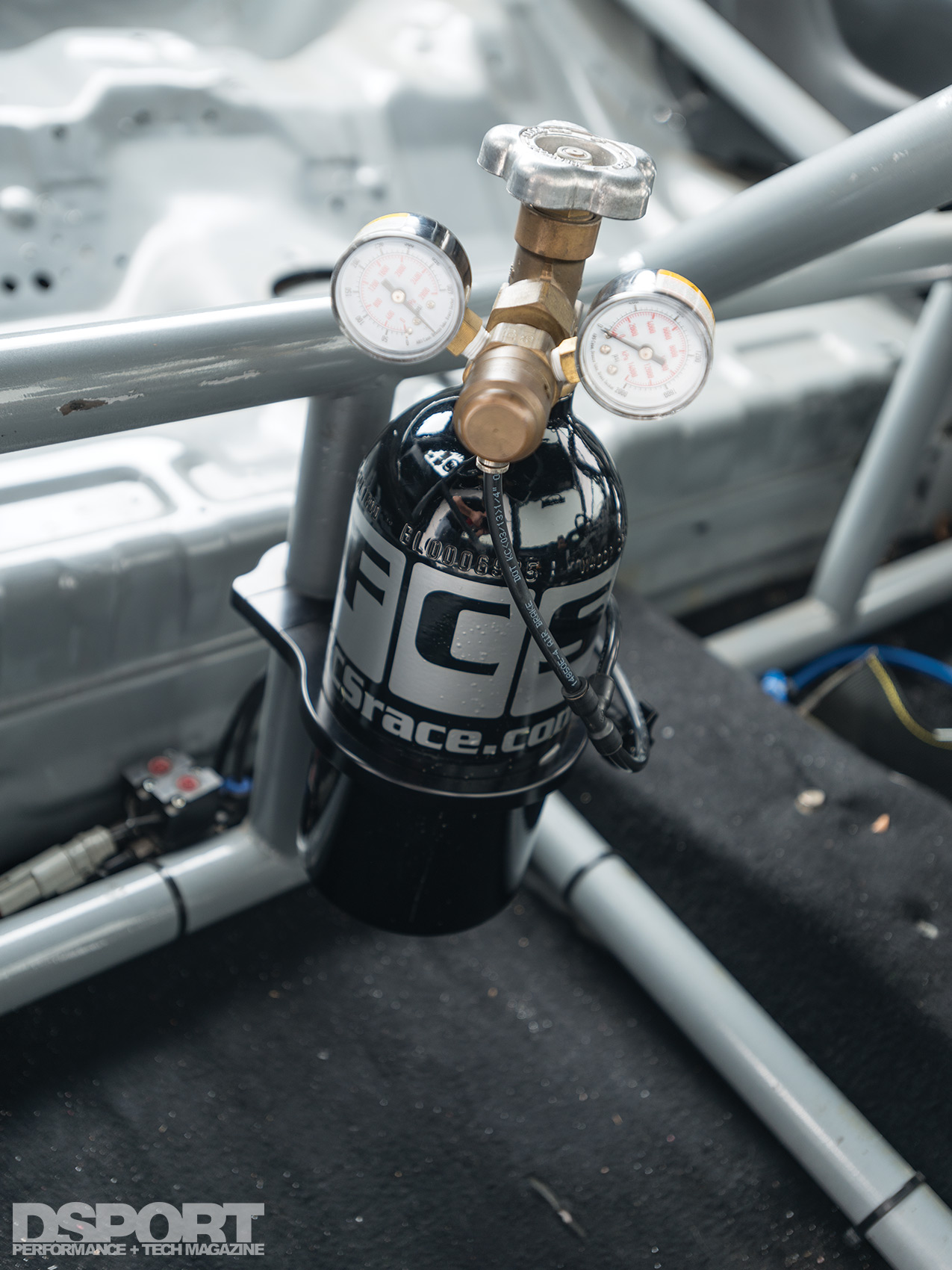 (L) The SFI 25.5 compliant cage includes added fortification to ensure the driver’s safety. A window net keeps the driver’s limbs inside in the case of a crash. (R) FCS installed a CO2 cannister to help maintain wastegate vacuum pressure and ultimately, boost pressure.