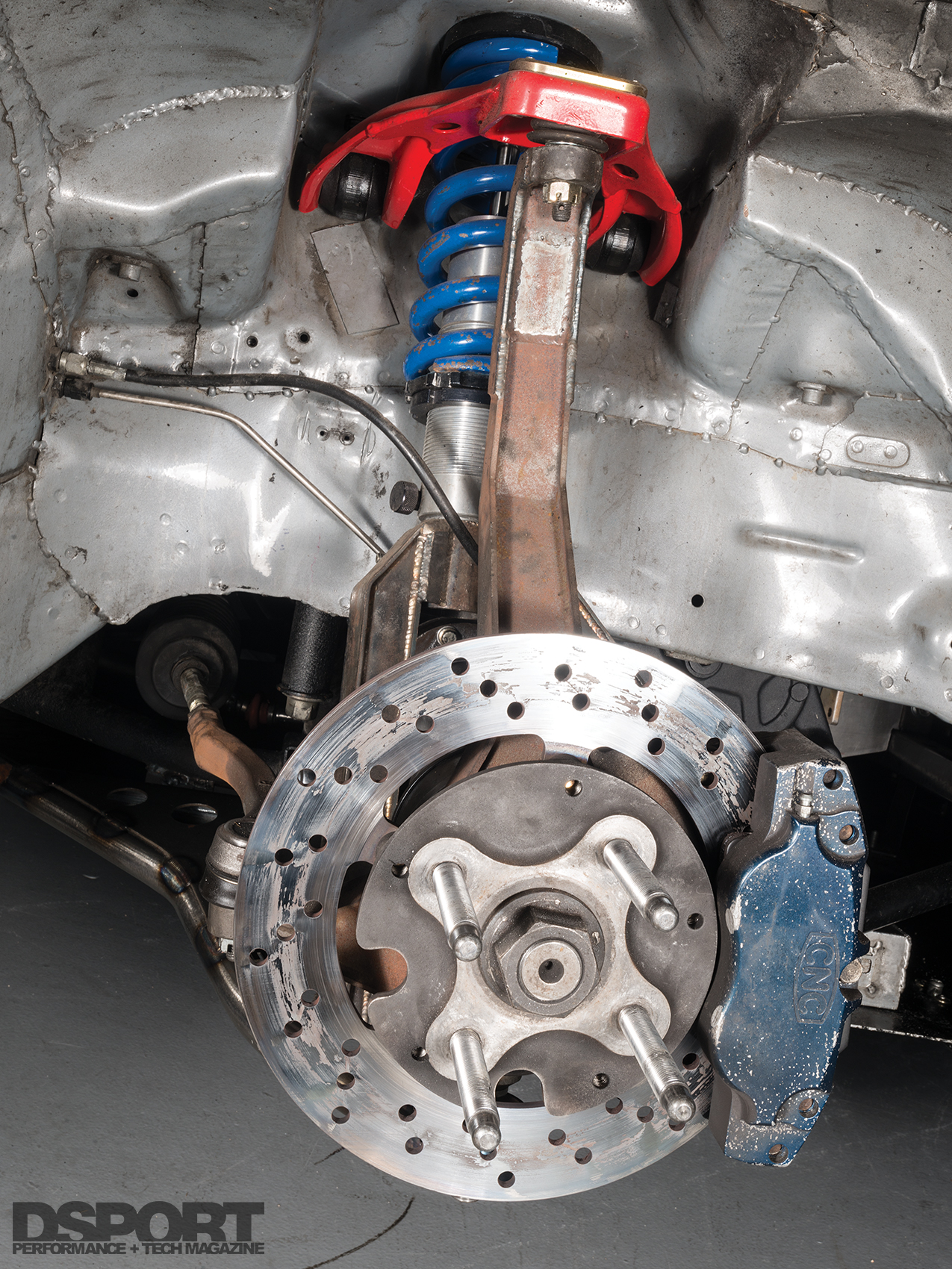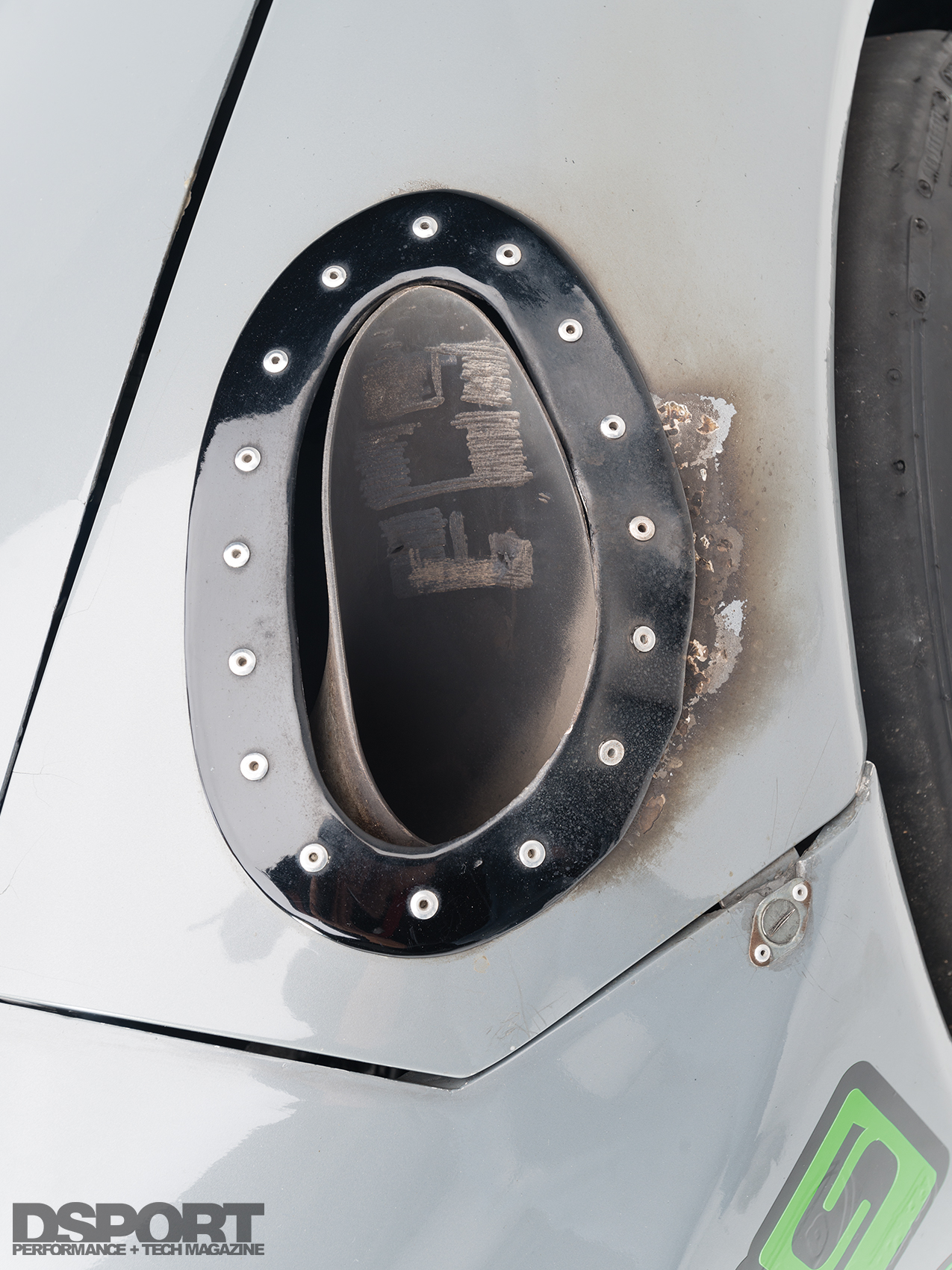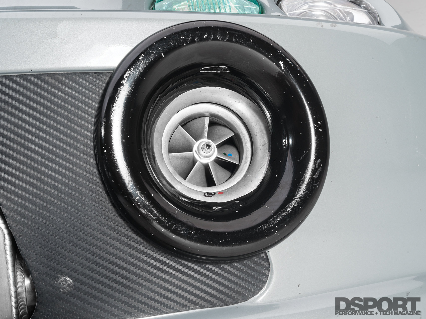(1)CNC worked with FCS to develop a small diameter brake system with stout four-piston calipers to fit the barrels of small diameter drag wheels. (2) An exhaust dump tube directs the exhaust gasses from the turbocharger out through the fender. (3) A drag chute assists the brakes with speed reduction at the top end of the track.