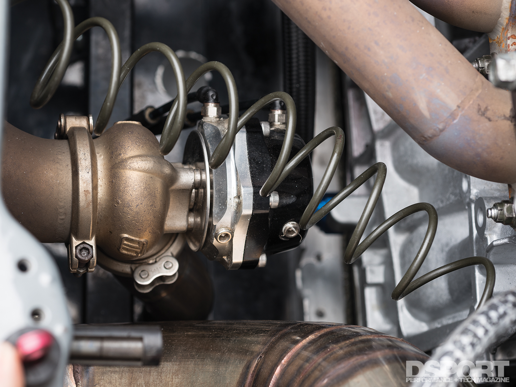 A 50mm Turbosmart Progate50 external wastegate works with a MoTeC boost control solenoid and the M800 Engine Management to keep the manifold pressurized at 42 psi.