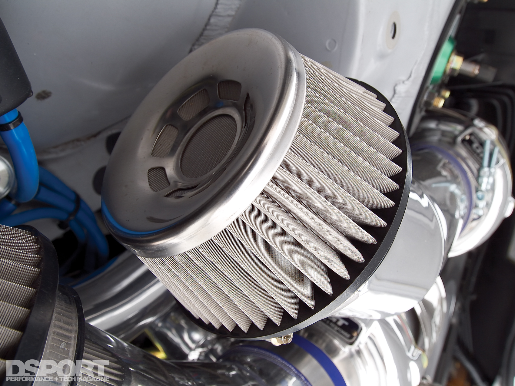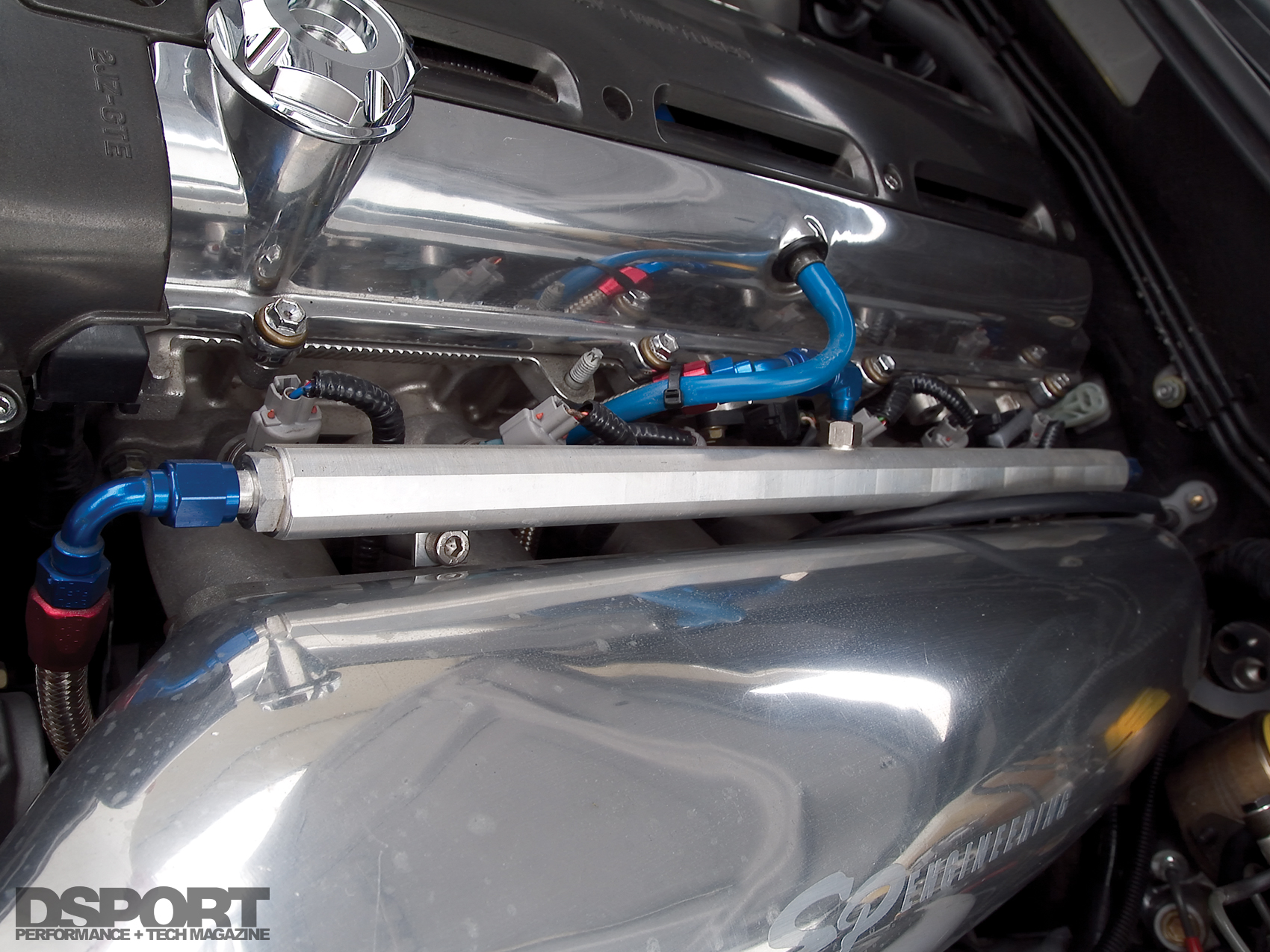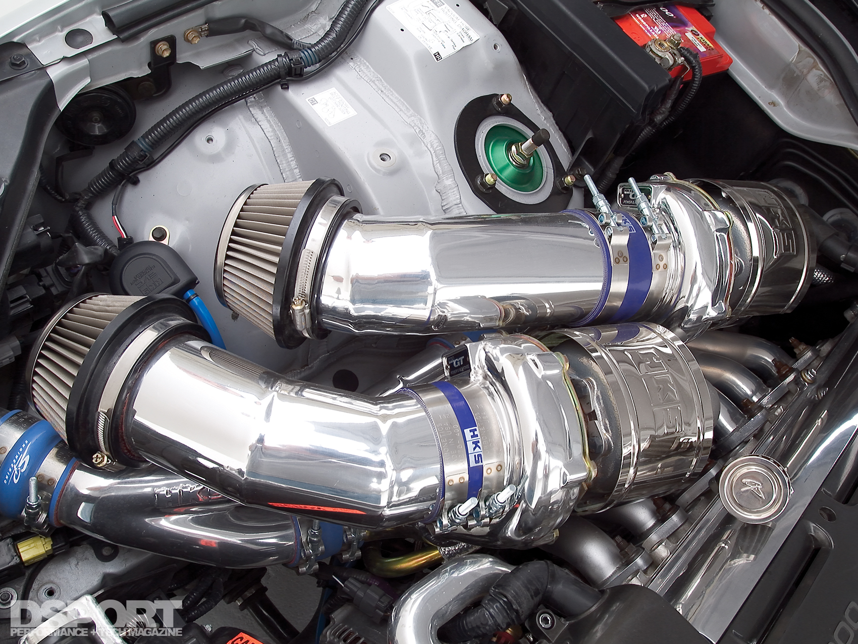 The pressurized air from the compressors is directed to a Blitz front mount intercooler before reaching the massive VeilSide surge tank and throttle body. Once past the intake manifold, a Portflow reworked cylinder head and HKS 272 camshafts control the Ferrea valvetrain that regulates the flow of air and fuel into the cylinders.