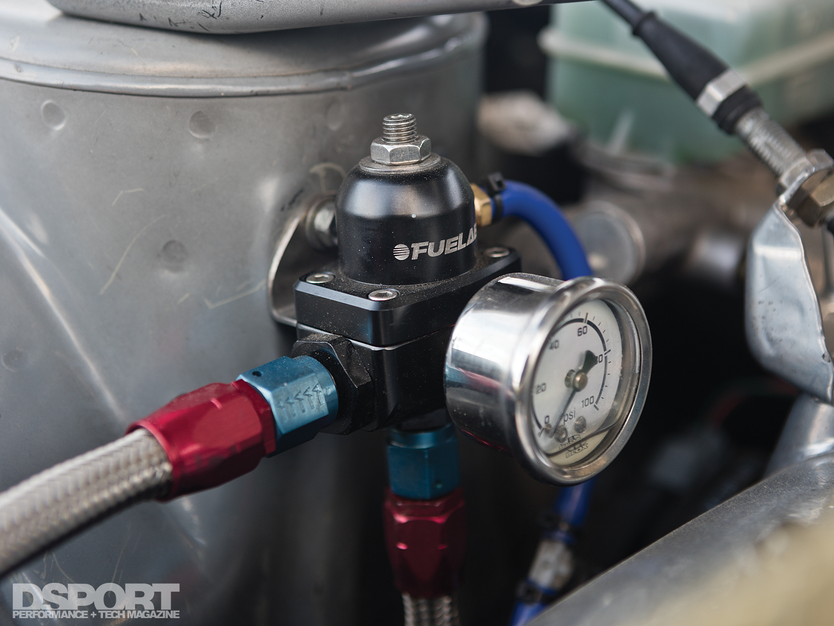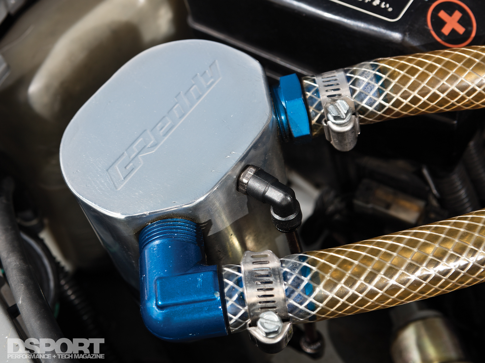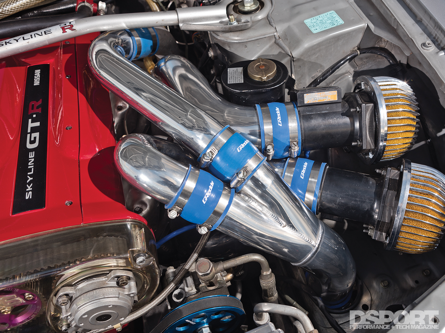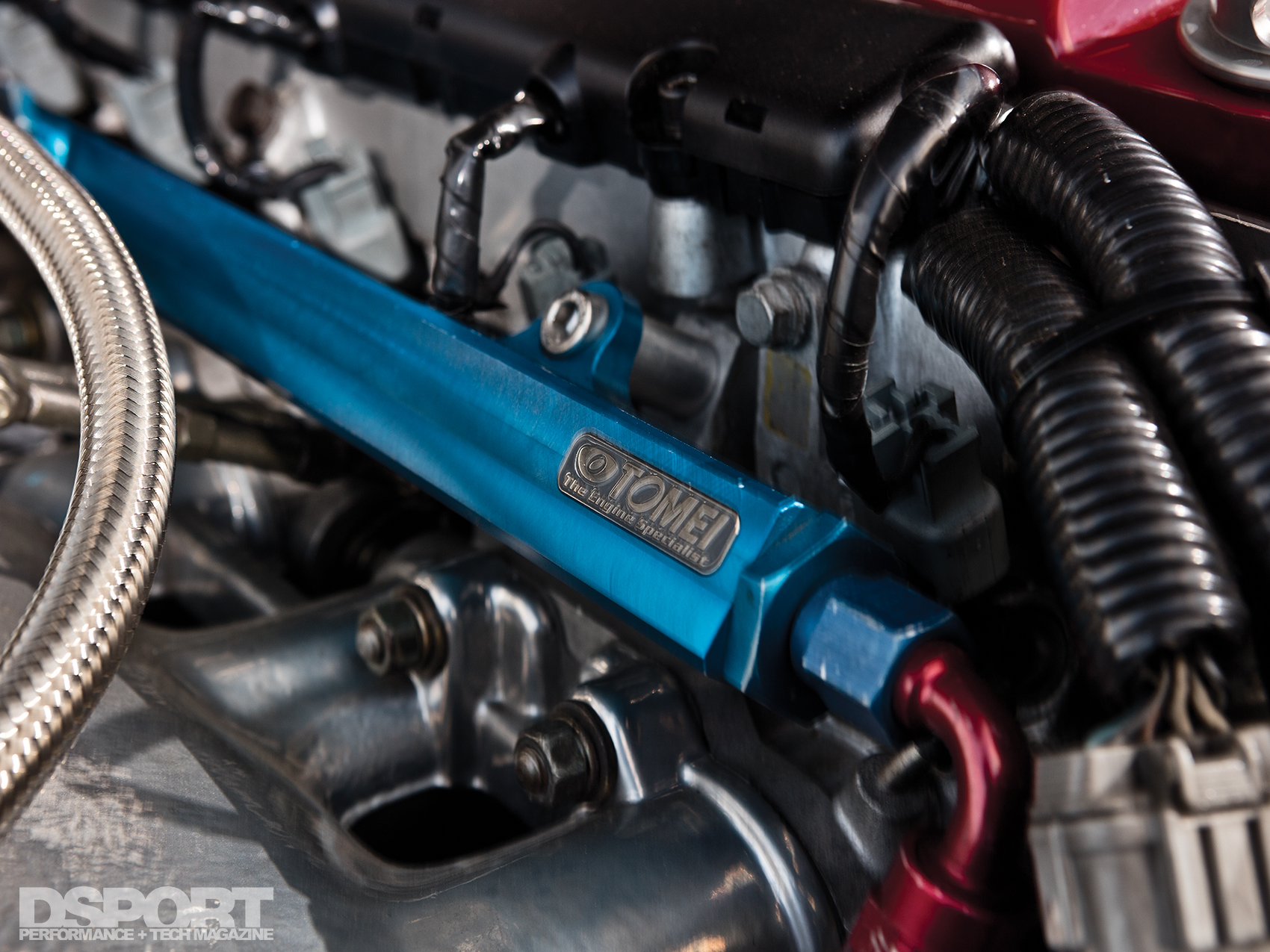 After finishing the longblock build, Craig looked for a pair of stock replacement turbochargers to provide a balance of response and increased output. He decided on a pair of Garrett GT2860R turbochargers, which were bolted up to the factory exhaust manifolds. The Garrett turbos feed compressed air into a GReddy front-mount intercooler. As the heat is drawn out of the air charge, the cooler, denser air makes its way to the factory intake plenum and individual throttle bodies. As the air charge flows past the throttle plates, Injector Dynamics ID1000 injectors spray fuel into the intake ports as the air/fuel mixture fills the cylinders.