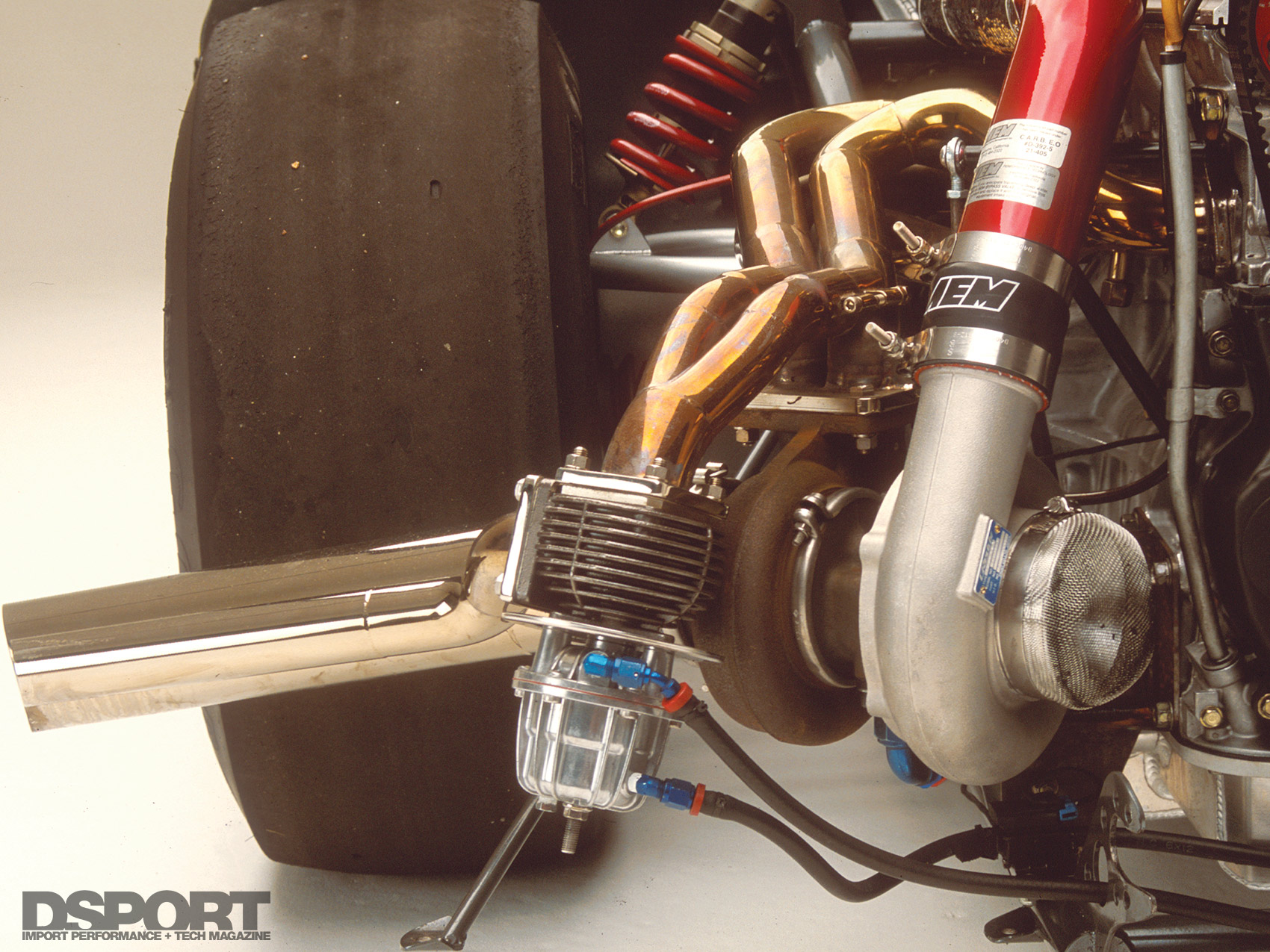 To feed enough air and fuel into the monster to make the power, the intake manifold was crafted out of carbon fiber. Eight 1600cc RC fuel injectors (that’s two per cylinder) were used to supply the massive amounts of m ethanol to the engine. Hi-Tech built the turbo manifold out of stainless steel, to connect a T88 GReddy Turbo charger, a key element in making over 700 horsepower with a four cylinder. The GReddy T88 forces air directly into the intake manifold. No air-to-air or air-to-liquid intercooler was used in order to save weight. Our theory was that the generous flow of methanol injected into the engine would cool the air charge from the turbo charger enough so an intercooler would not be necessary.
