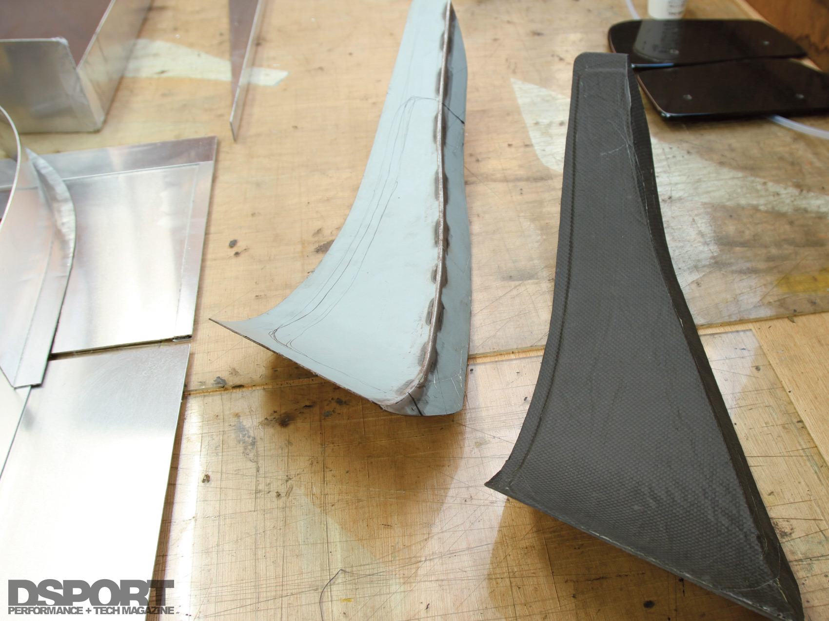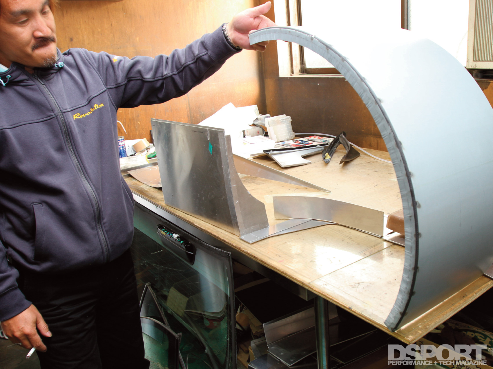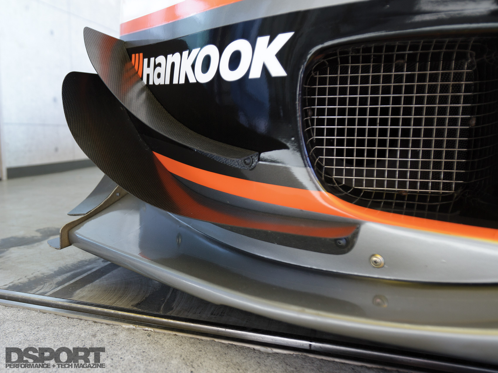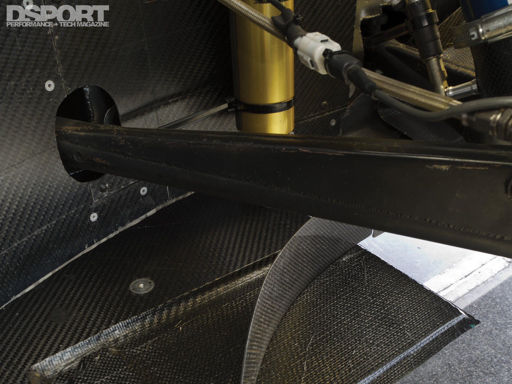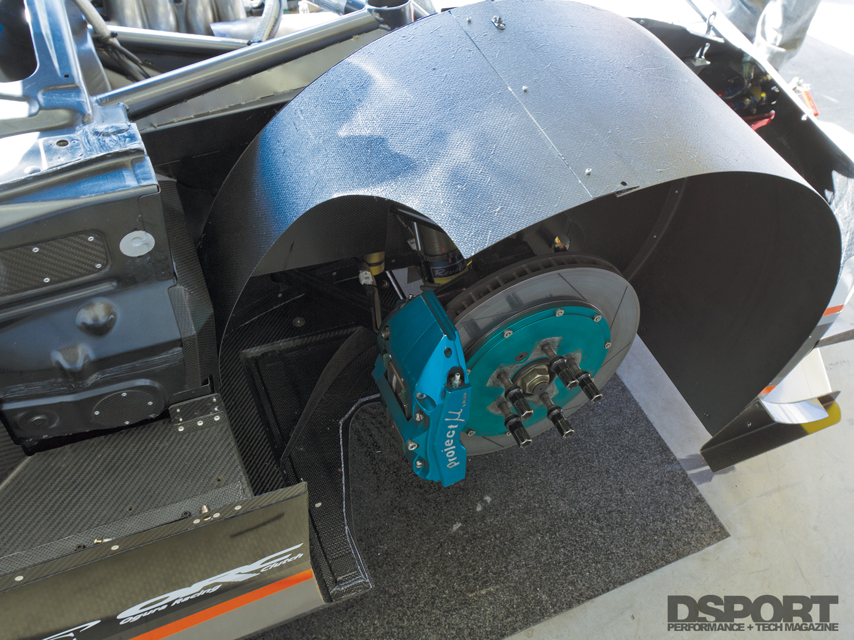 Once back at Revolution’s shop in Saitama, Aoki began mocking up the pieces he wanted to make out of dry carbon-fiber. Revolution has an autoclave in house, enabling Aoki to make his own dry carbon-fiber pieces. At the front, ports in the bumper force-feed air through carbon-fiber ducts around the inner tire well and out through the wide- fender vents. He also fashioned a set of twin canards for additional downforce. At the rear, the diffuser also benefitted from additional canards and air channels, while the rear wing layout was improved. Revisions were made to the rear suspension geometry to further improve handling.