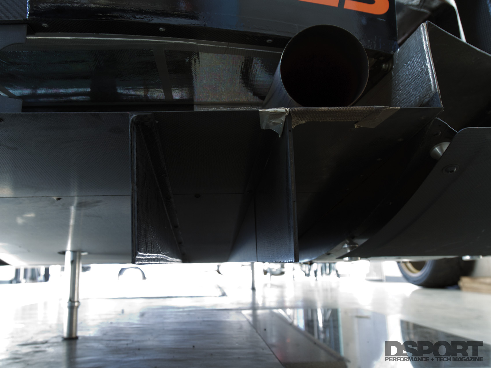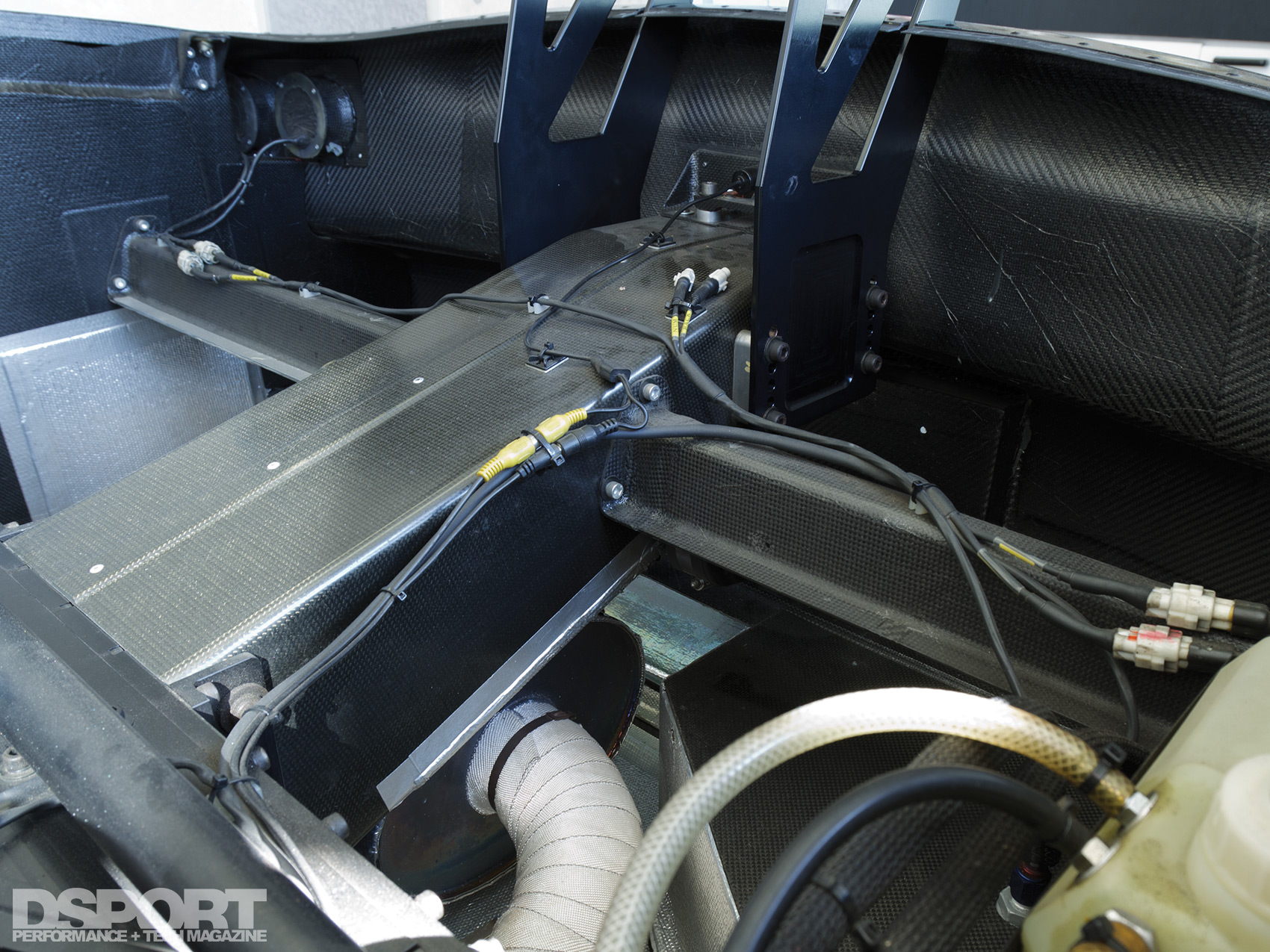 At the rear of the chassis a custom dry carbon-fiber wing- stay (1) unites to the rear section of the RE Amemiya GT300 shell while symmetrical lattice bracing (2) reinforces the back-halved chassis. Effectively managing airflow is key to generating downforce so under chassis ducting (3) helps channel air toward the rear diffusers (4) for greater adhesion and handling. Ducting in the front bumper (5) along with dual canards (6) help manage air into the chassis and around the front suspension (7) while the large vented fenders (8 and 9) efficiently help evacuate high pressure air to increase downforce.