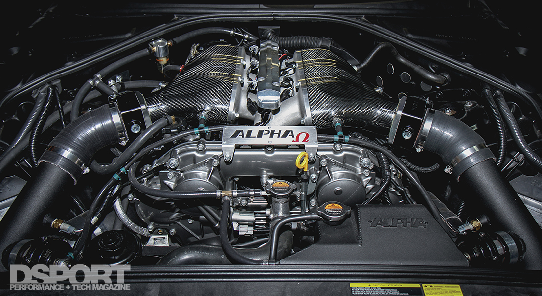 AMS/Alpha Performance’s path to groom the Omega into a seven-second record-setter took four years to accomplish. During that time, the byproduct of AMS’ racing efforts was the birth of new, greater performing Alpha packages refined for consumers. Since its feature in DSPORT, the sleeved, bored and stroked VR38 engine that got the Omega into the sevens was retired in favor of Alpha Performance’s new R35 VR38 billet aluminum block late in 2014. The billet block featured iron sleeves, a 1mm larger bore, Manley Alpha-spec pistons, BME Alpha-spec rods and a stroker crankshaft. This combination increased the displacement from 4,001.3cc to 4,083cc. The Alpha Performance CNC cylinder heads carried over from the previous engine, but now rely on TOMEI Powered Alpha-spec camshafts to lift the valvetrain. With larger Omega-spec turbochargers supplying 52-psi boost pressure to the engine, output increased to an estimated 2,200 horsepower with over 1,100 lb-ft torque.
