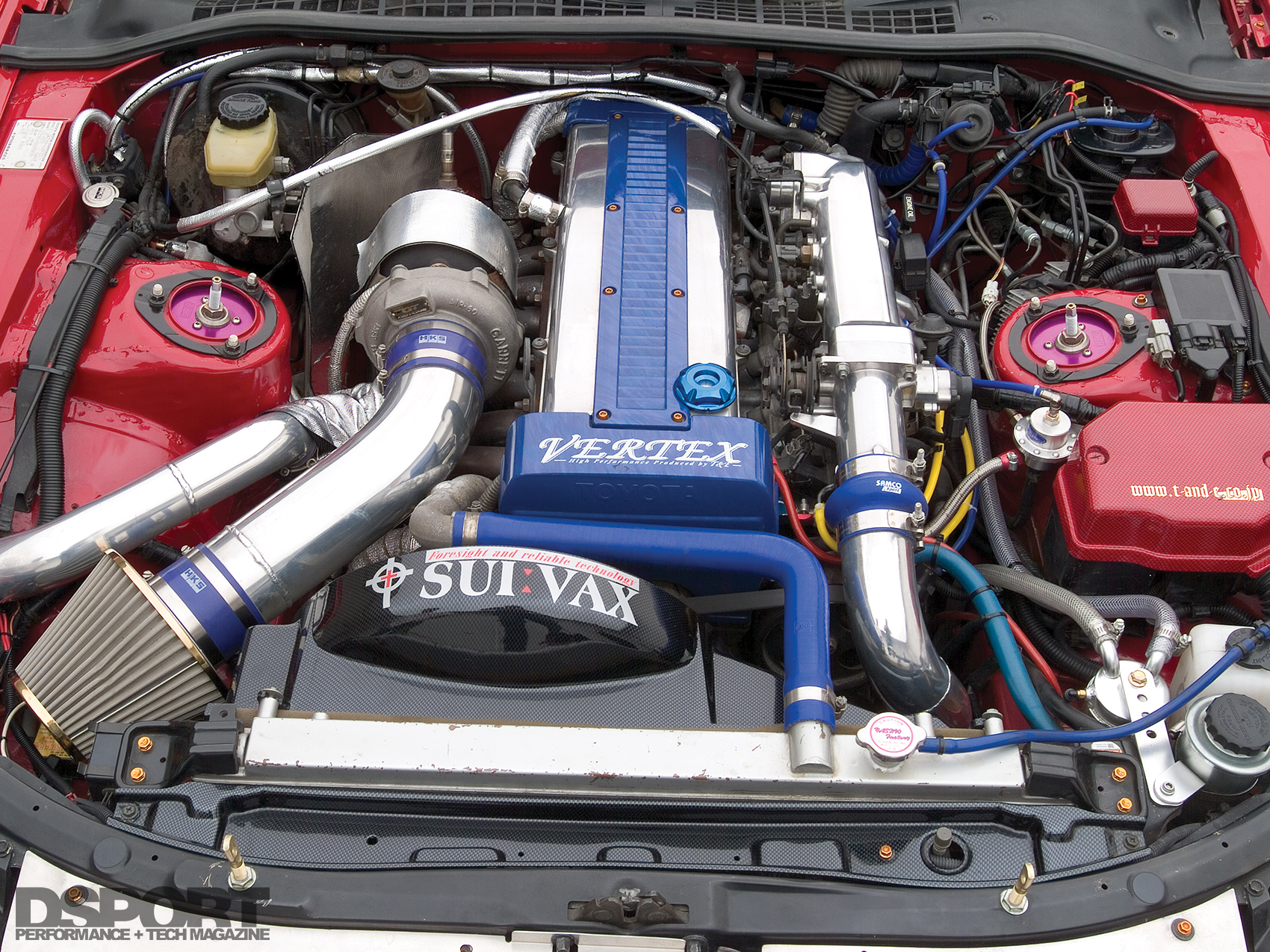 In Japan, a number of Toyota creations are powered by a 1JZ-GTE powerplant. This engine is a 2.5-liter in-line six cylinder that is twin- turbocharged from the factory. Carrying the same bore size as the 2JZ-GTE (86mm), the stroke of the 1JZ engine is just 71.5mm. These specs are almost identical to the RB25 Nissan engine. Sporting the Japanese-mandated 280 horsepower (@ 6200rpm), the 1JZ- GTE can easily be tuned to the 350 horsepower range with bolt ons and the stock turbos. With a responsive and highly-streetable single turbo upgrade 450 to 500 horsepower can be achieved.