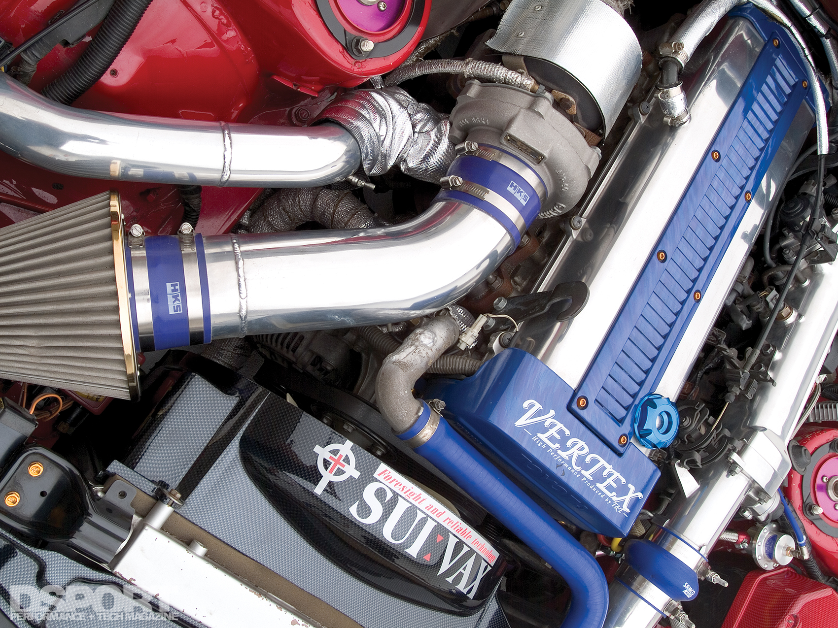 Since 500 wheel horsepower was the target for this Soarer, there was no need to address the short block of the 1JZ. Instead, attention was put on the right mixture of bolt-on parts that could produce 490 horsepower while still maintaining excellent boost response.
