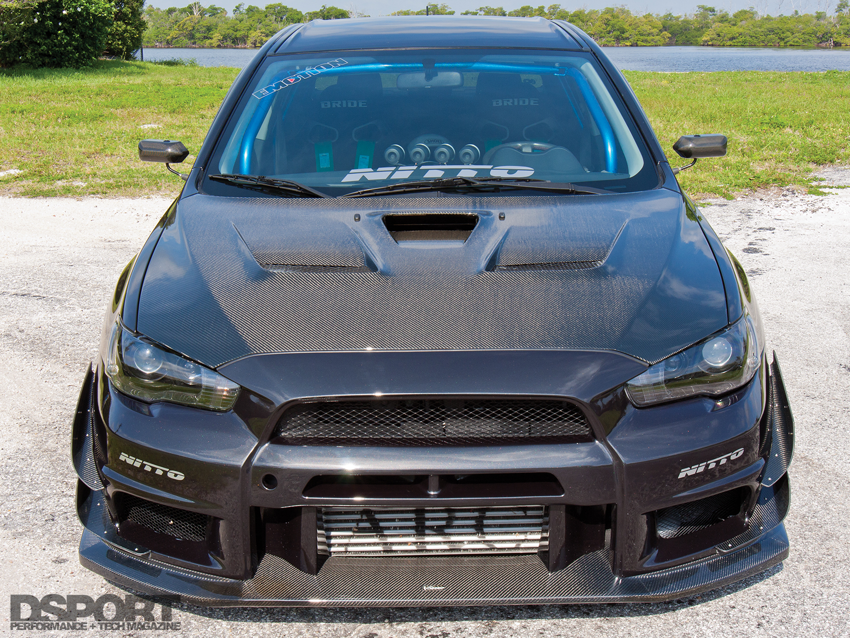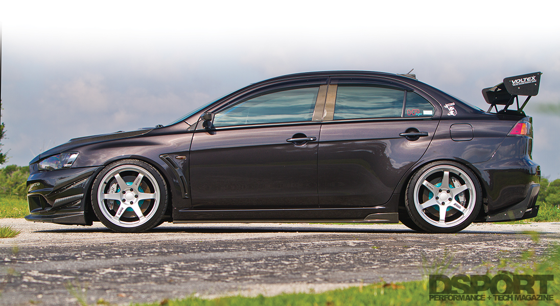 After replacing the modified RX-7 with the 2008 EVO MR here, Diaz missed the admiration he previously received in his “fast-looking” car. In response, the initial round of modifications to the EVO X focused on aesthetic upgrades. “I built toward a JDM look. Not because I think it’s the best there is or because it’s ‘JDM’. I simply like the styling,” he explains. To that end, Diaz installed several Varis carbon-fiber aero pieces including a vented hood, front lip spoiler and rear diffuser. He added Chargespeed carbon fiber side skirts and a roof-fin vortex generator to round out the aero enhancements.