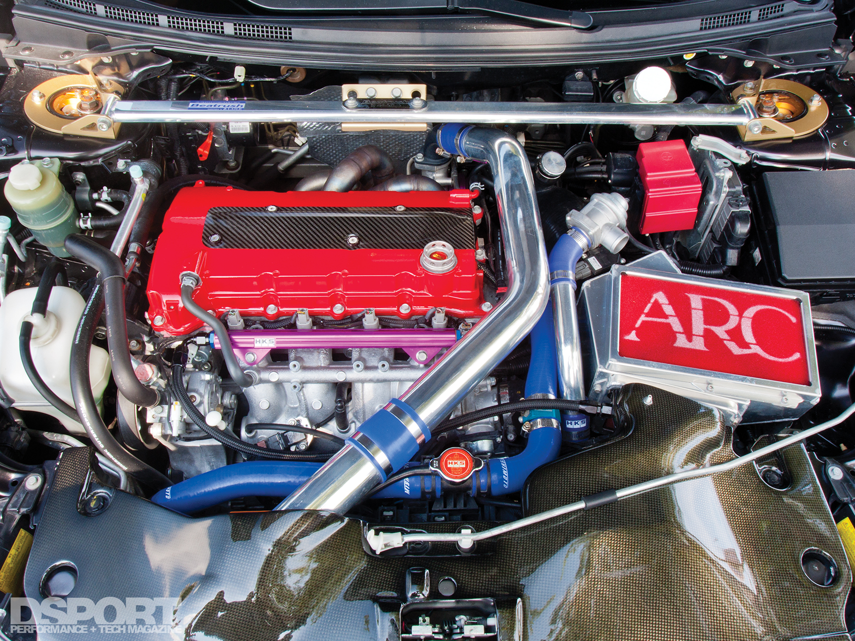 With a new turbo taking the lead, a new supporting cast was in order. A complete ARC-branded intake charge- air system consisting of front-mount intercooler, matching intercooler piping and aluminum airbox replaced the factory units. To meet the fuel requirements of the larger turbo, Diaz employed a host of HKS and SARD fuel components. With all the components in place, Diaz’ EVO registers 480 whp at its 7,600 RPM peak on a Mustang Dyno all-wheel-drive dynamometer on a diet of 93-octane pump gas. A stock EVO MR on the same dyno delivers 240 whp for comparison. To validate the goal of making a true street car, Diaz’ component selections and corresponding engine-management tuning allow the EVO to produce its peak 368 lb-ft of torque at a very usable 4,900 RPM.