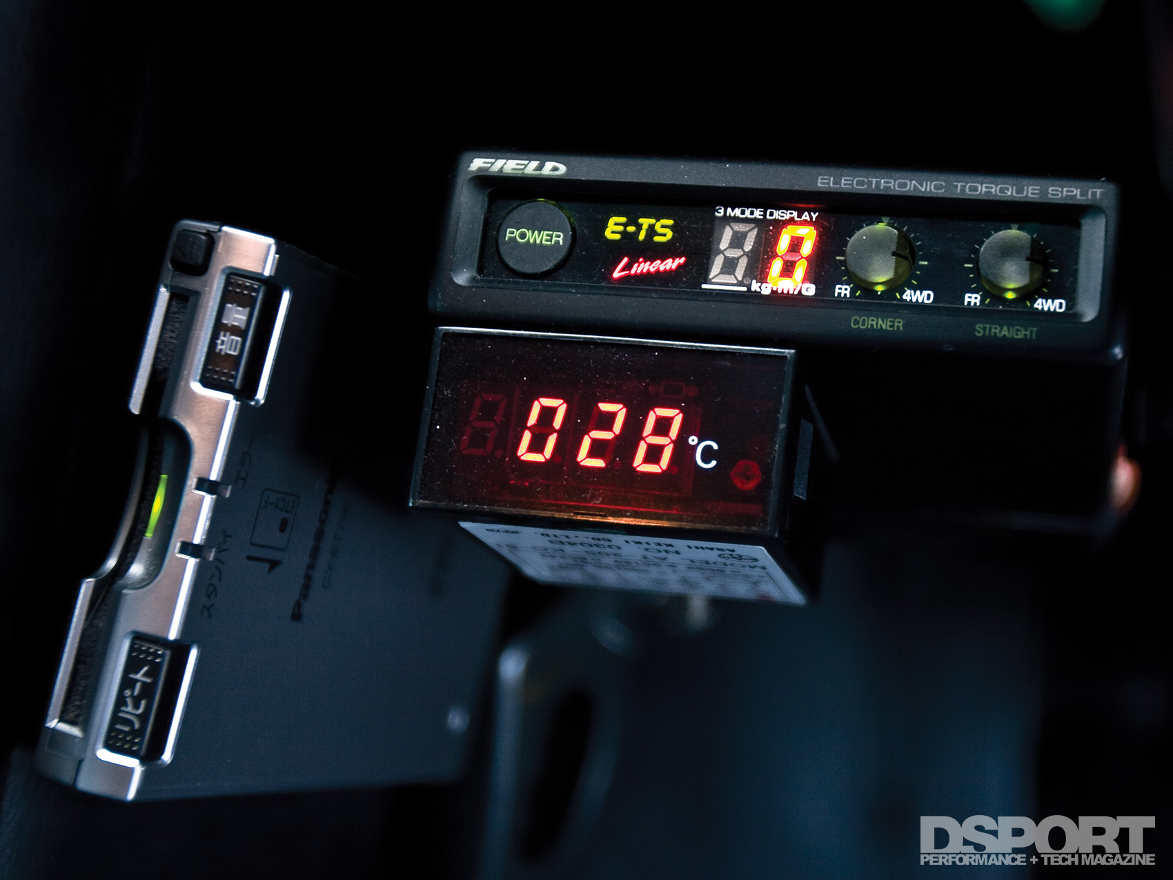 Converting 602 horsepower from the crankshaft into motion requires a compatible driveline. Fukuda’s logical choice was an Exedy Carbon-D twin-plate clutch and lightened flywheel to turn the input shaft of the factory Getrag transmission. The power is divided between the front wheels by a NISMO 1.0- way limited-slip differential and the rear wheels by a Cusco 2.0-way limited-slip differential. Adding further tuning capacity, a Field E-TS Linear torque split controller facilitates customized torque split between the front and rear.