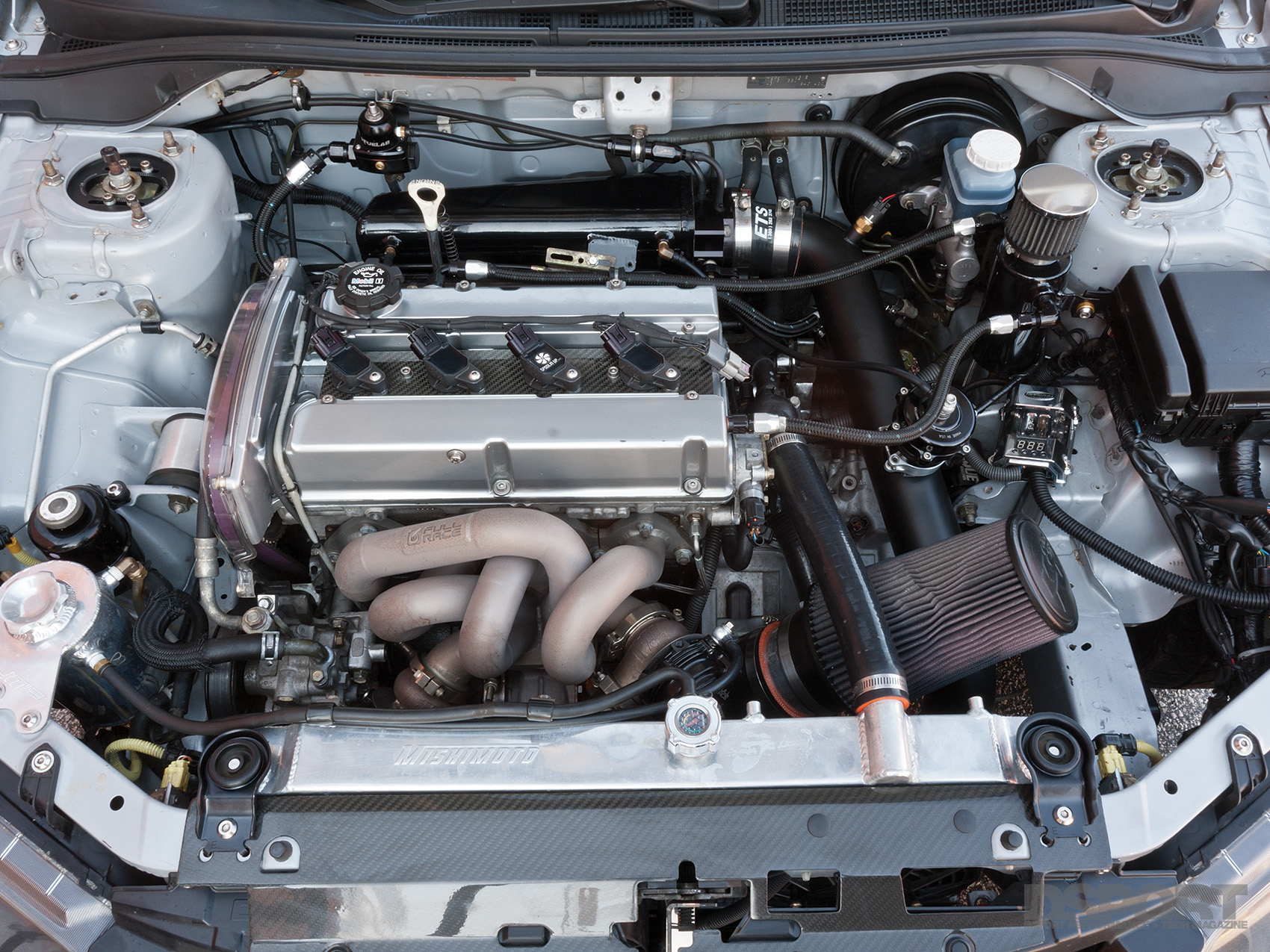 With a larger mill in place, attention shifted to a new turbo setup. A BorgWarner S300SX turbocharger fed by a Full-Race exhaust manifold took its place on the hot side of the head for boost duty. With the boost dialed up to 36 psi by way of a Hallman Manual Boost Controller, Force-Fed’s tuner Babi Berrios went to work on the AEM V1 engine management system to optimize the tune for the new displacement and increased boost levels. Strapped to an AWD Dynojet Dynamometer, Treadway’s EVO was just short of target, producing 775 horsepower and 612 lb-ft torque to the wheels.