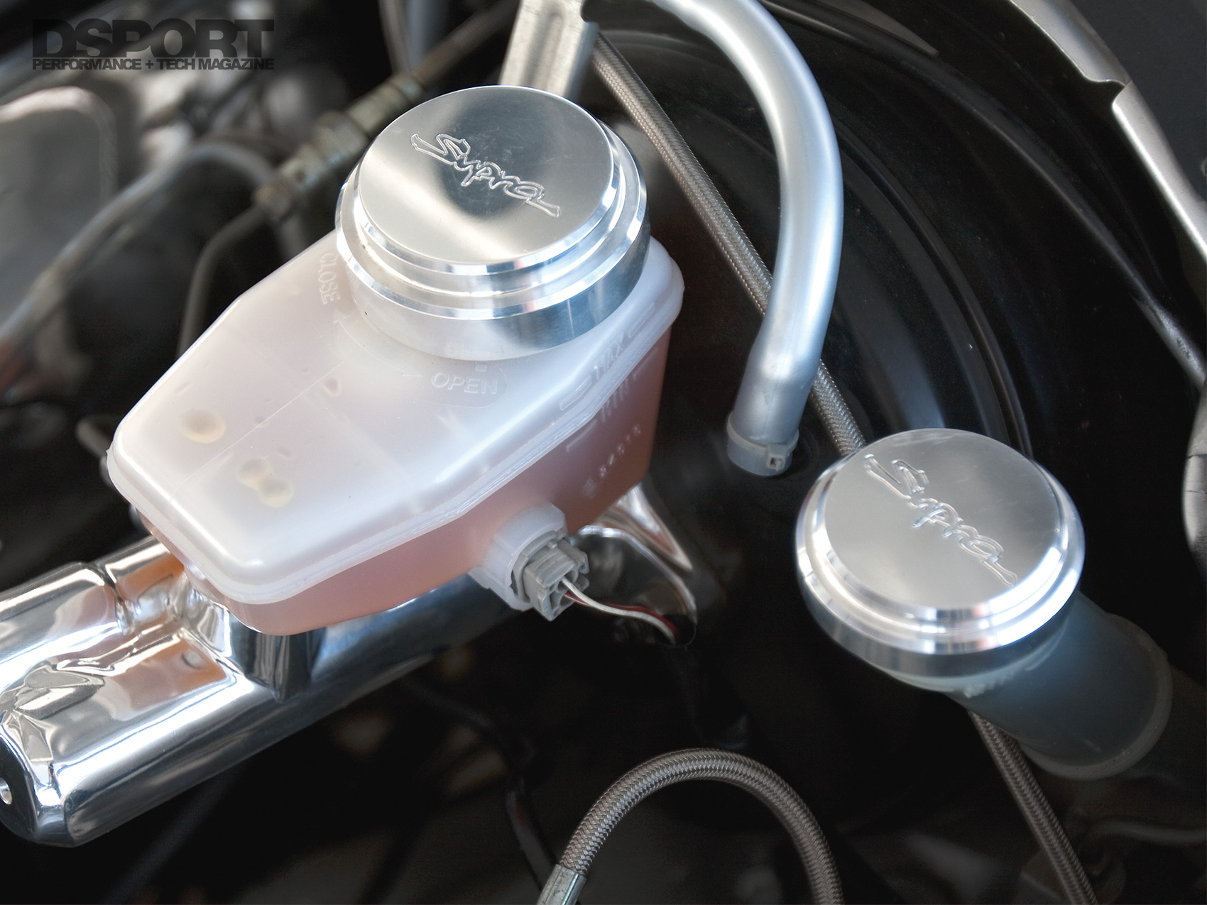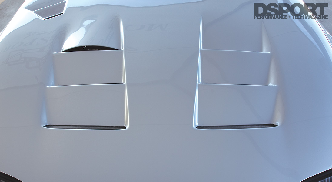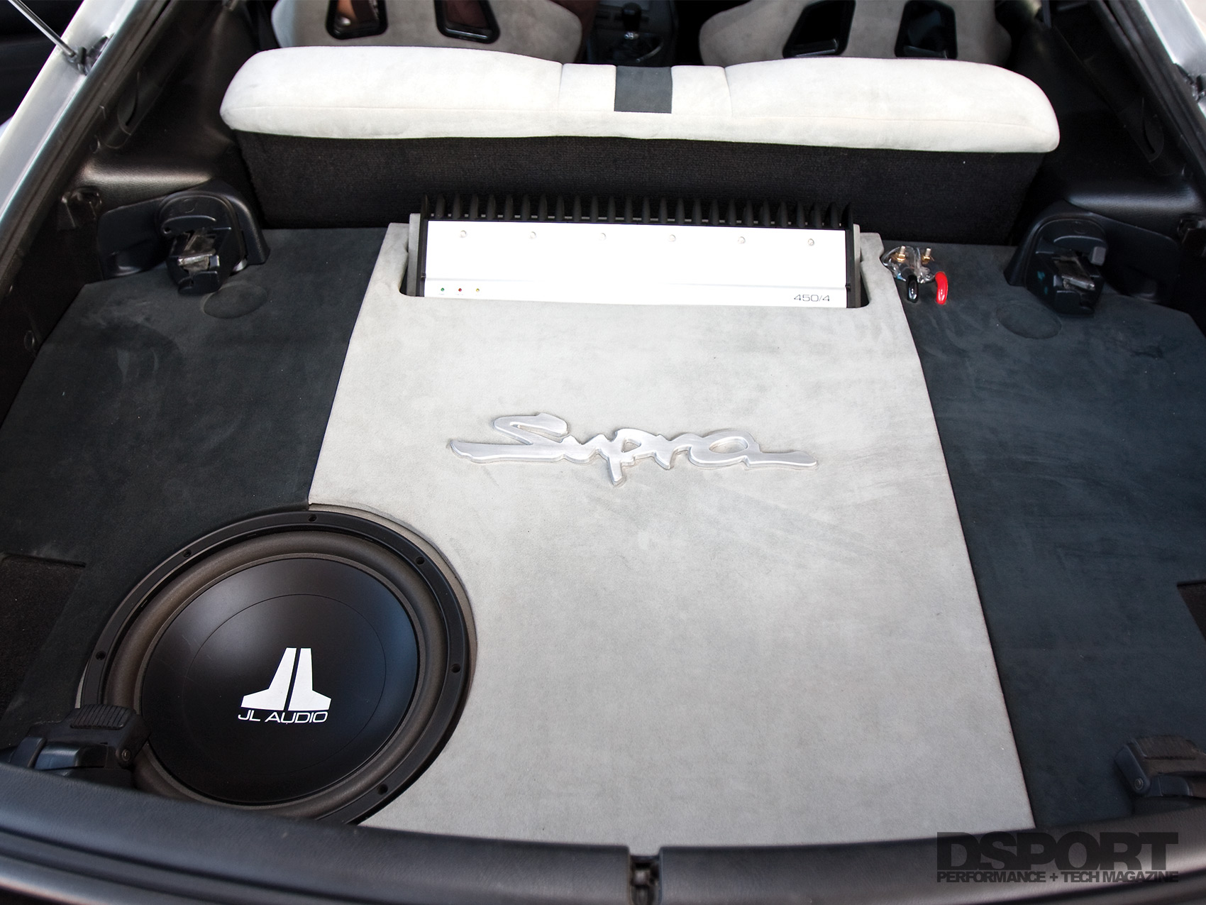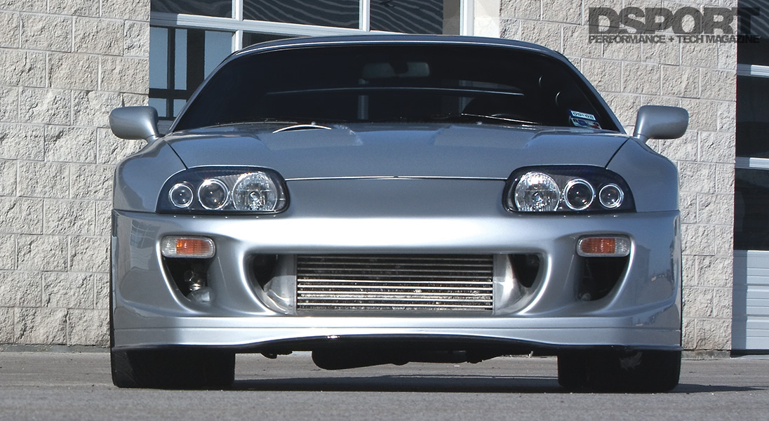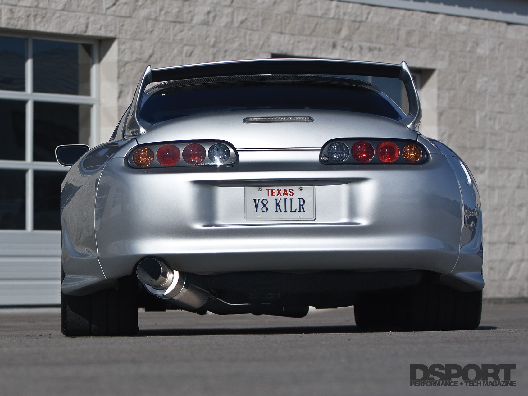 In order to be satisfied with his build, Dusty looked for a unique appearance that would set his Supra apart from all others on the road. He decided on a full Ridox wide-body kit from Japan. Ridox, a brand affiliated with Japanese professional driver and Supraphile Manabu “Max” Orido, set this quicksilver Supra apart while staying true to much of the original factory bodylines. A TOP SECRET hood was customized with a slight bulge to accommodate the large compressor housing of the PR turbocharger. As a finishing touch, a Rod Millen Motorsports carbon-fiber wing replaced the stock unit on the hatch lid, delivering additional downforce over the rear wheels.