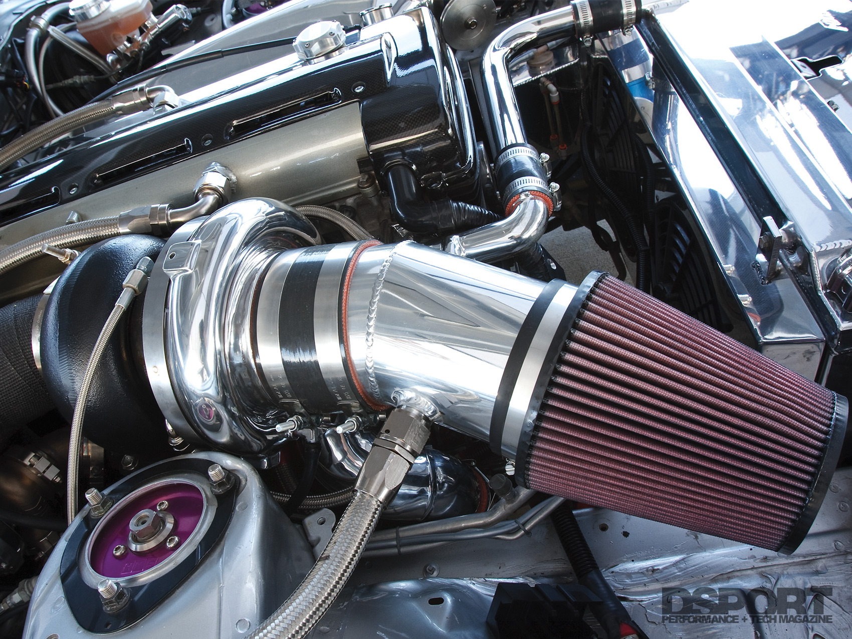 Big power requires a big turbo. An equal-length Full Race manifold collects and channels the exhaust gasses into the inlet of the PR GT80 DBB turbocharger. To cool the pressurized charge air generated by the mammoth compressor, a GReddy 4-row front-mount intercooler takes its place in the front bumper. Once chilled, the cooler, denser air reaches the 100mm throttle body of the Veilside intake manifold. The Veilside manifold delivers the air evenly across all six intake ports.