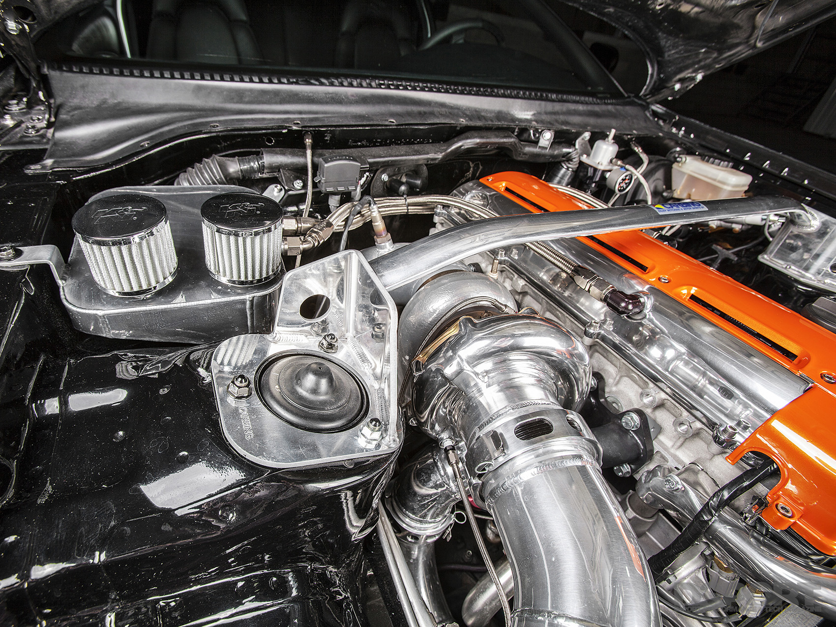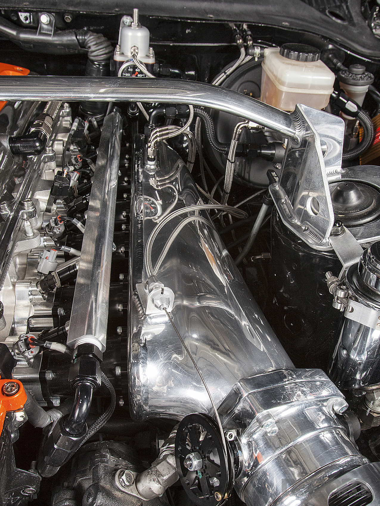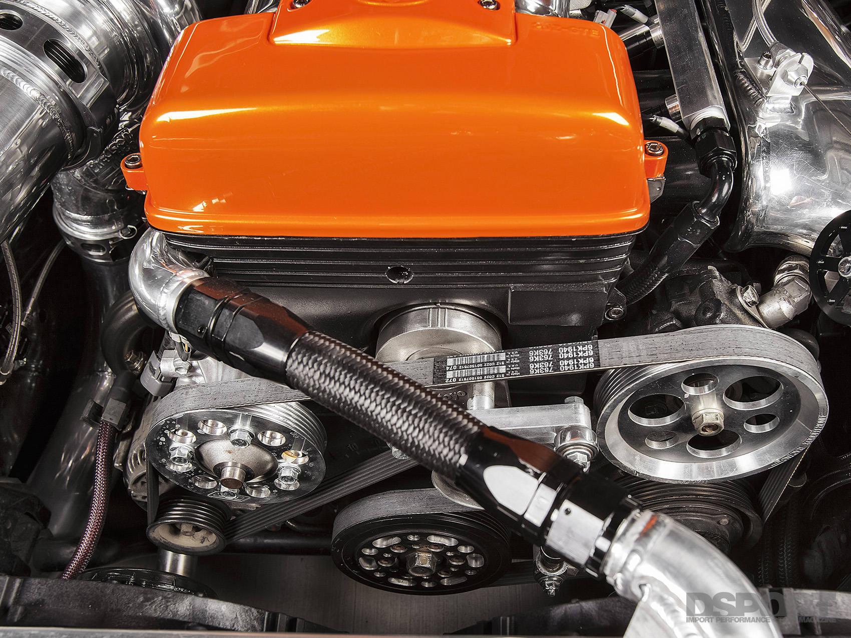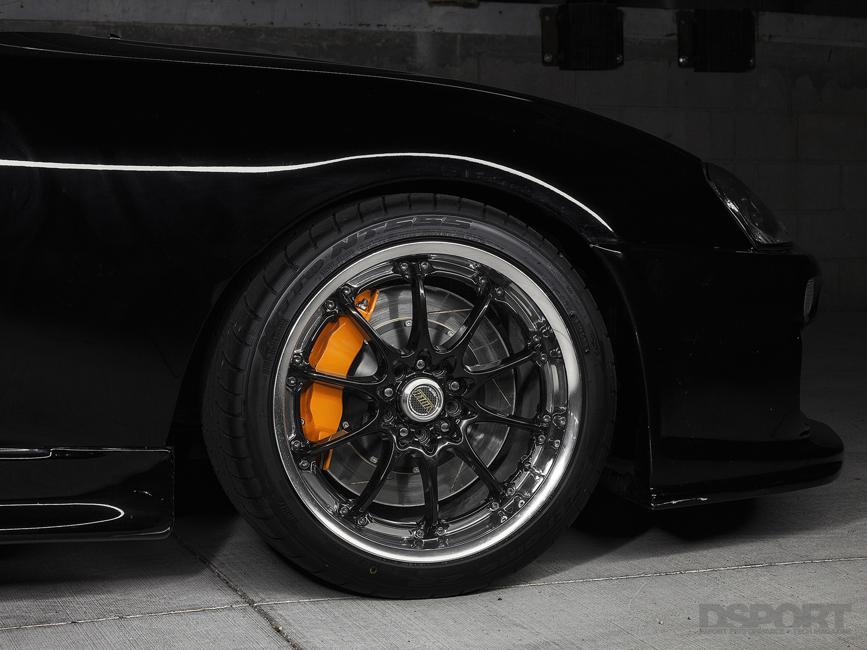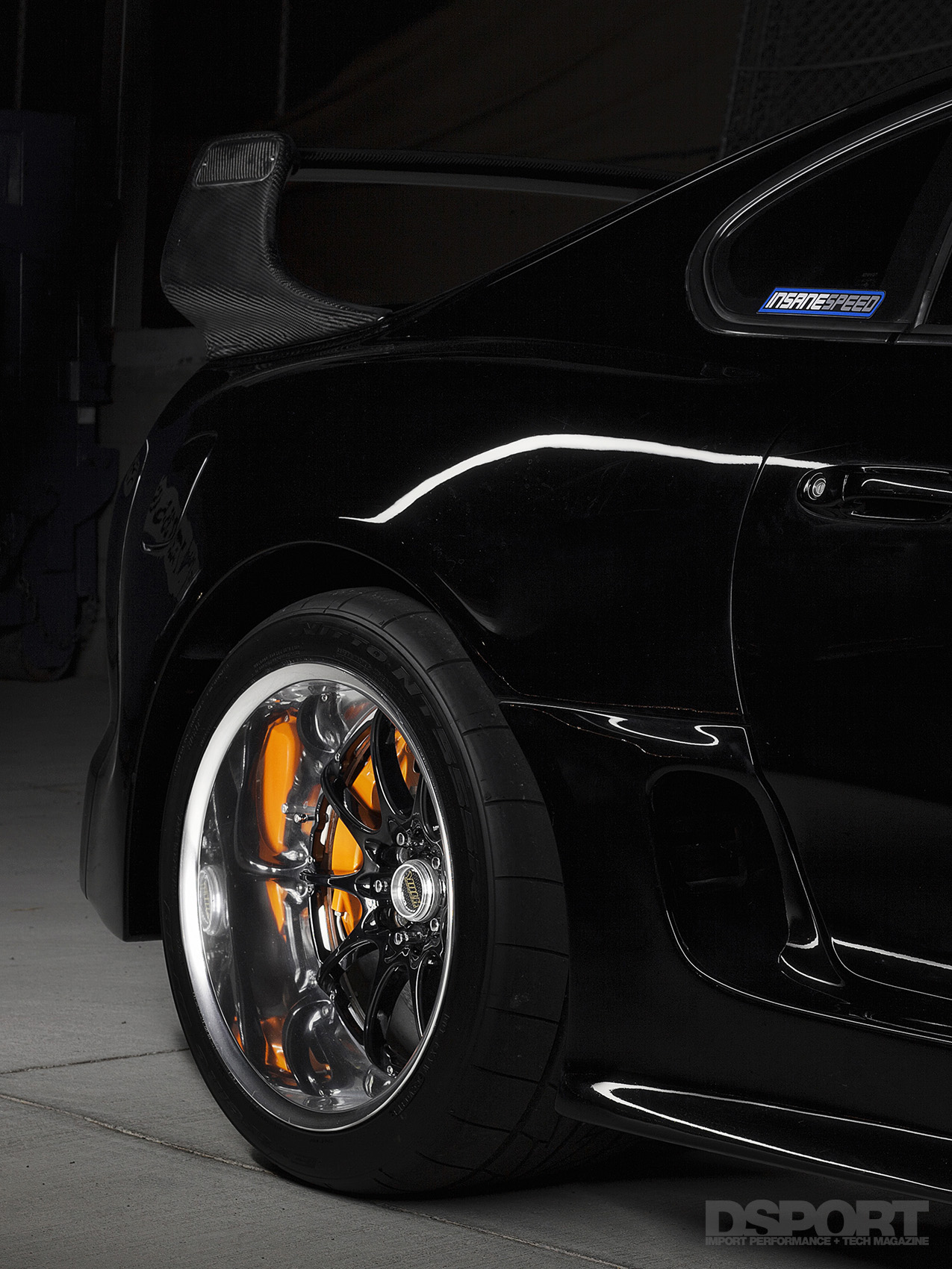 Street Supra Setting up the Supra for the street was an essential part of the plan; thus a mixture of handling, control and appearance needed to be addressed. To this end, KW’s V3 adjustable coil-over dampers were added, lowering the chassis just enough to close the gap between the wheel arches and the Volk GT-N wheels mounted with Nitto 555 tires. To force the Nittos to bite into the asphalt and to shed speed, the brake system was upgraded with a StopTech big brake kit at all four corners. The Lamborghini orange calipers can be seen peeking through the spokes of the GT-Ns. Finally, for an aesthetic touch, a combination of TRD and Do-Luck aero components add width and style to the Supra’s timeless bodylines.