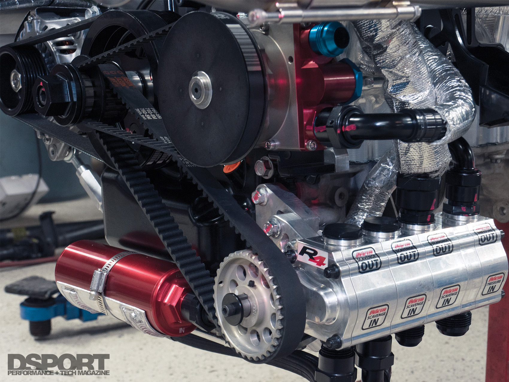 (L) The radiator was moved to the back to make room for the massive Garrett GTX turbochargers at the front. (M) AMS modified a Magnus Motorsports dry sump system to ensure the consistent oiling of the ALPHA billet aluminum black. (R) T1 Race Development’s mechanical fuel pump keeps the methanol flowing.