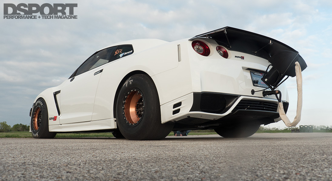 Gideon “Gidi” Chamdi offers a prime example of this attitude. He captured the GT-R Quick Class victory at the 2014 Shootout presented by Buschur Racing with his blue ALPHA 16 GT-R, which earned him a feature in the pages of DSPORT magazine (Issue #155, June 2015). Between Shootouts, he put this GT-R through an evolution, going from ALPHA 16 to 18 to 20. With the GT-R running in championship form, Chamdi returned to compete in the Quick Class again at the 2015 Shootout. Unfortunately, during an exhibition pass that was sure to be deep in the seven-second realm, smoke began to billow at the top end of the track. An unexpected loss of traction followed, sending Chamdi and his ALPHA 20 GT-R into the K-rail. Although the GT-R was totaled, Chamdi thankfully walked away unscathed.