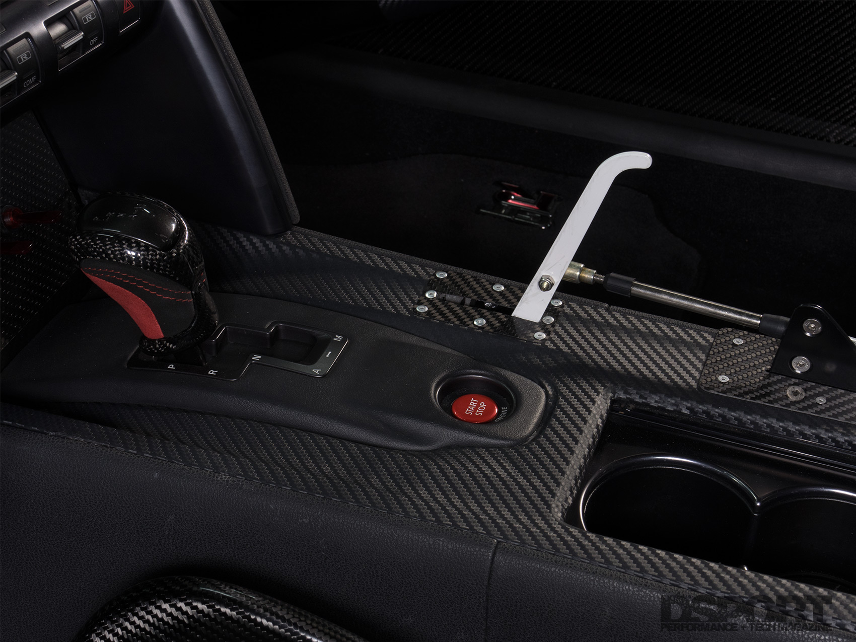 Unlike the ALPHA Omega, which was intended to retain as much of its streetcar persona as possible while competing on the world stage, the ALPHA G was not constrained by any particular criteria besides retaining its full chassis, shell, dashboard and carpet. Fabricator Dominic Markiewicz started by welding in a custom cage to stiffen and fortify the chassis. To offset some of the weight gained, numerous carbon-fiber panels replaced their metal counterparts, including an ALPHA carbon-Kevlar hood, roof and trunk lid, and a pair of Overtake carbon-fiber doors with ALPHA carbon-fiber door panels.