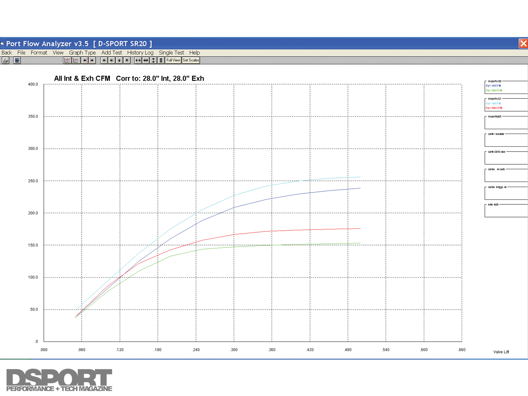 Once the SR head returned to America, it paid a visit to Tom Fujita at Port Flow Design to be flow tested on the Super Flow SF-600 flow bench that measured our KA24 cylinder head (see Issue #91, July 2010). Employing the same testing method as had been performed on the KA24 head, Tom measured the flow of a stock SR20 head as a baseline to compare against the TOMEI POWERED Genesis cylinder head. On the intake side, the best improvements were noted at only 0.05-inch lift, where a 26-percent improvement in flow was measured. At the maximum lift tested (0.45-inch), the gain was 8-percent. On the exhaust side, the best gain was noted at 0.40-inch lift where a 15-percent improvement was realized. At max lift, gains were on the order of 14.8-percent. These results were interesting, as TOMEI POWERED did not modify the ports dramatically. The transition from the throat to the bowl was smoothed after seating the +1mm valves, but the ports remained largely untouched. When we inquired with Allen Lorenzo of TOMEI POWERED, he commented, “We smoothed the ports and transitions between the throat and the bowl for the larger valves, but we prefer to leave as much cylinder head material as possible for the consumer, should further customization of the head become necessary.” When we compare the percentages against the KA, it would appear the SR head realized greater improvements. However, when comparing the Exhaust-to-Intake Ratios (E/I ratio – see chart), a different story is told. The SR head falls below the desired 80-percent range from 0.25 inch through maximum lift. This lower E/I ratio indicates room for improvement but also means the turbocharger may spool up more quickly, eliminating the KA24’s 97cc displacement advantage.