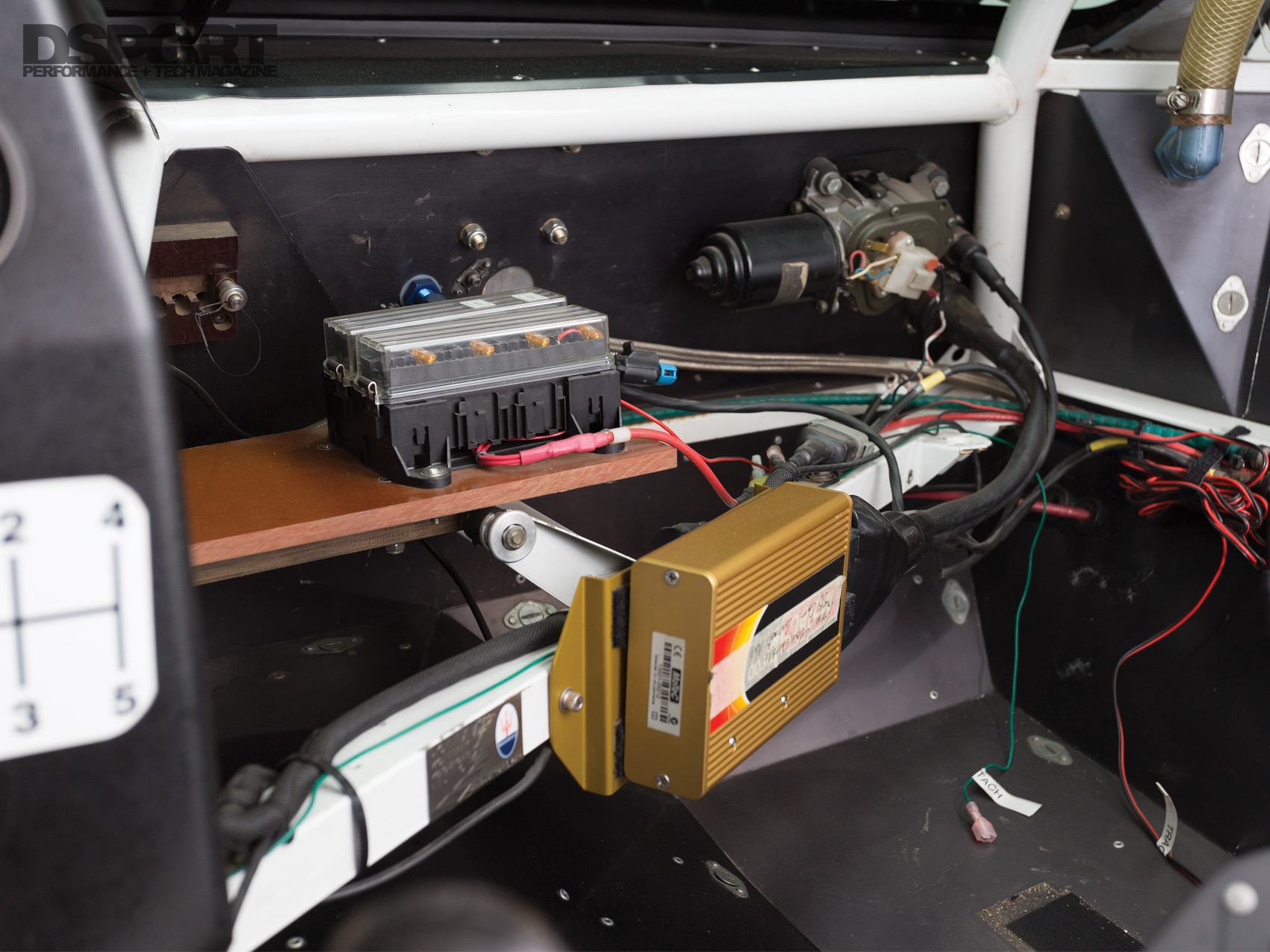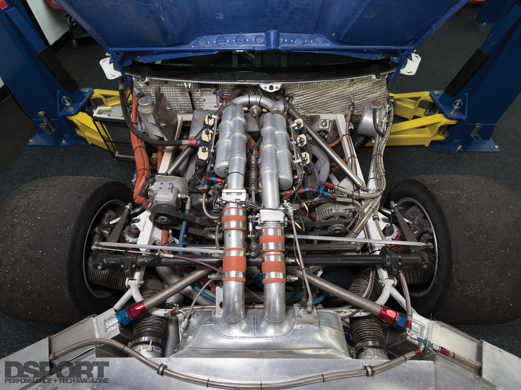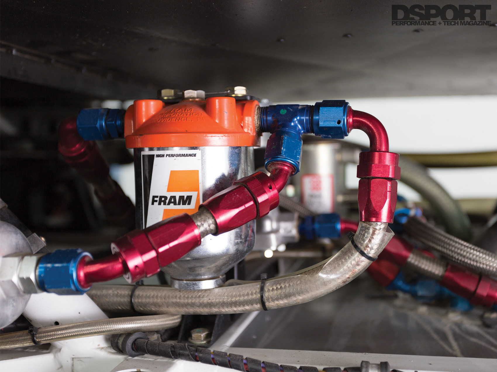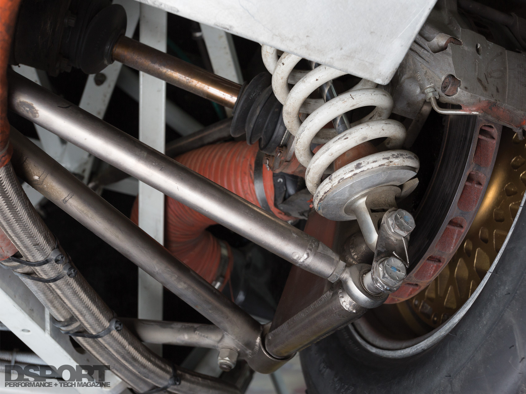 Purpose built racecars rarely share parts with streetcars. The -AN lines and fittings, the switch panel, the use of spherical joints and the custom suspension arms were made for this car.