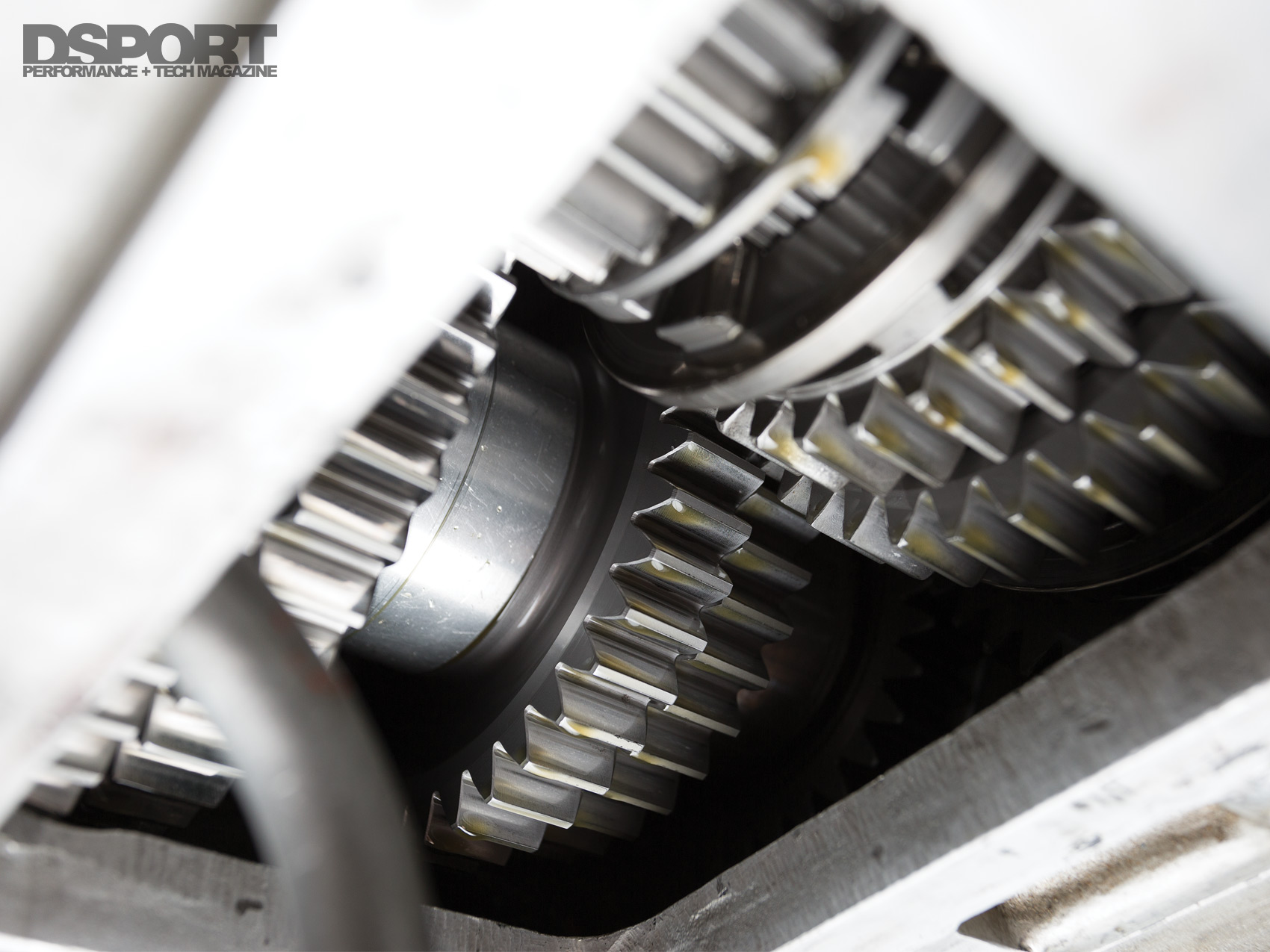 (L) The VG30ET engine that powers this Z features a number of purpose built components. It is pressurized by a single turbocharger that purportedly helped the engine generate over 1,000 horsepower. (R) The dog-engagement, straight-cut gears of the Weismann transmission feature an access panel for quick gear ratio swaps.