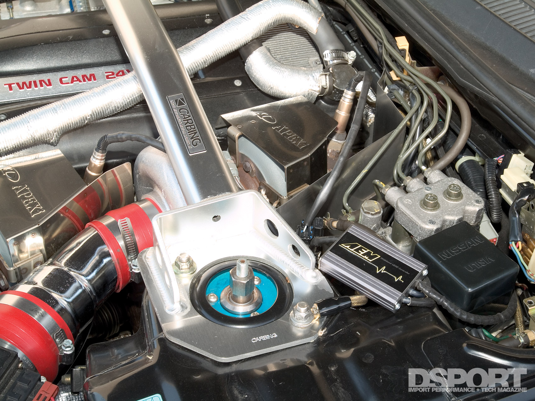 Upon inspection of the crankcase ventilation system and turbocharger system, we believe that we’ve identified the culprit. Our RB26DETT crankcase ventilation system is currently identical to the factory configuration. Under vacuum, the positive crankcase ventilation (PCV) valve is held open by manifold vacuum. Crankcase vapors are sucked through the intake manifold and are eventually fed into the combustion chambers. When no vacuum is present or the intake manifold is in a boost condition, the PCV valves closes. With the PCV valve closed crankcase pressure gets directed to the breather fitting on the top of the passenger side valve cover. This breather fitting attaches to the intake pipe feeding the turbocharger by way of a 3/4-inch hose. When the turbocharger is ingesting large amounts of air, a vacuum is created in this 3/4-inch hose. Along with the crankcase vapors a small amount of engine oil becomes drawn into the turbochargers air intake pipe. Normally the small amount of oil drawn through the intake system would not amount to a problem. Due to a special circumstance on our application (the absence of a blow- off valve), this oil would be one half of the recipe needed to foul our air flow meters. The other half of our recipe for disaster would require that air flow would have to become reversed in the intake air pipe. Normally, this would never be seen, however since our turbocharger system lacks a blow-off-valve, that’s exactly what we experienced. Since we are using IHI RX6B turbochargers, no blow off valve is required. The IHI RX6B ball-bearing turbochargers are built tough enough to endure the surge effects encountered when the throttle is closed under boost. It’s our belief that our current configuration allows for oil to be drawn into the intake pipe when the turbos are ingesting large quantities of air and then this oil is blown on to the air flow meters when the throttle is closed under boost.