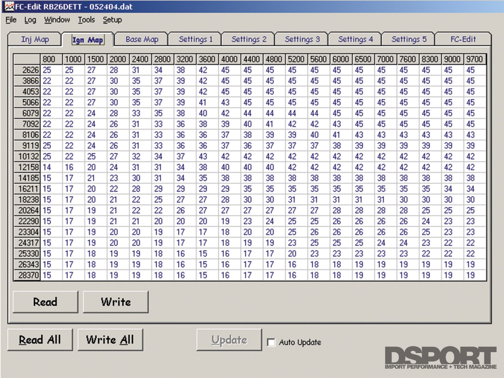 | Swapping over from the L-Jetro (Mass Air Sensor) POWER FC to the D-Jetro (Speed Density) version requirred a complete retuning of all fuel and igntion maps. We started on the 4wd dyno at low boost levels to begin the process. Without increasing boost levels, we were able to find some major power gains over the base program. |